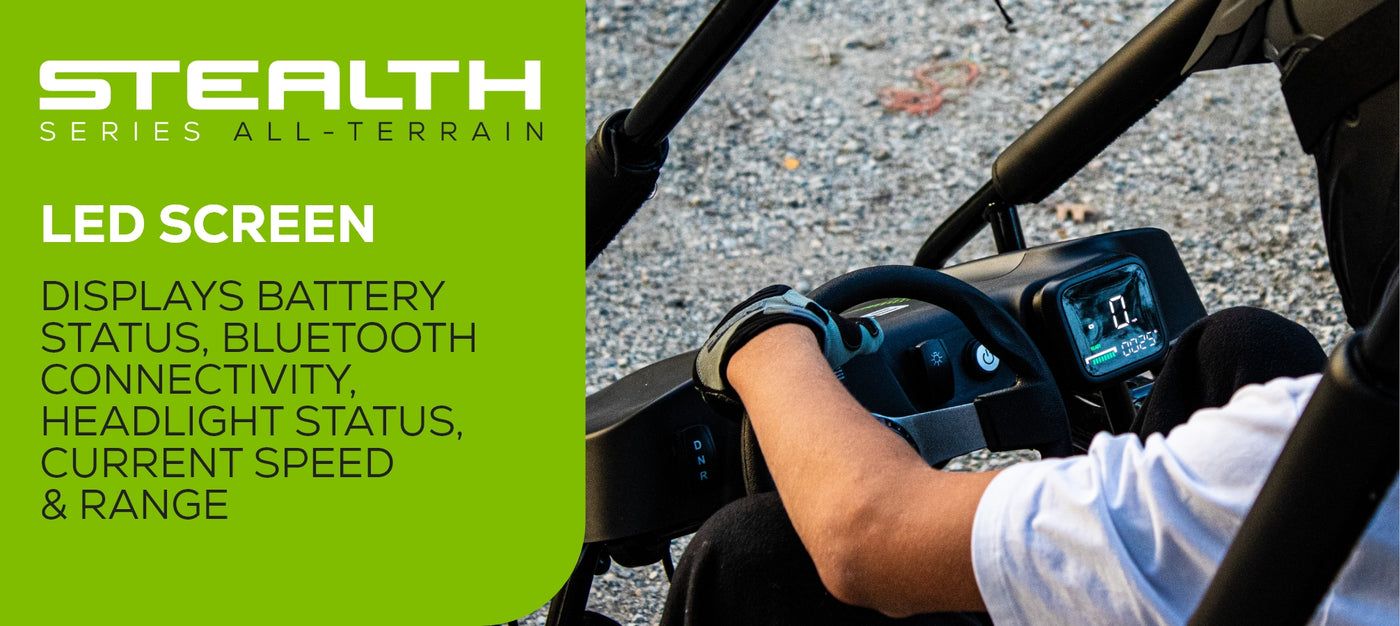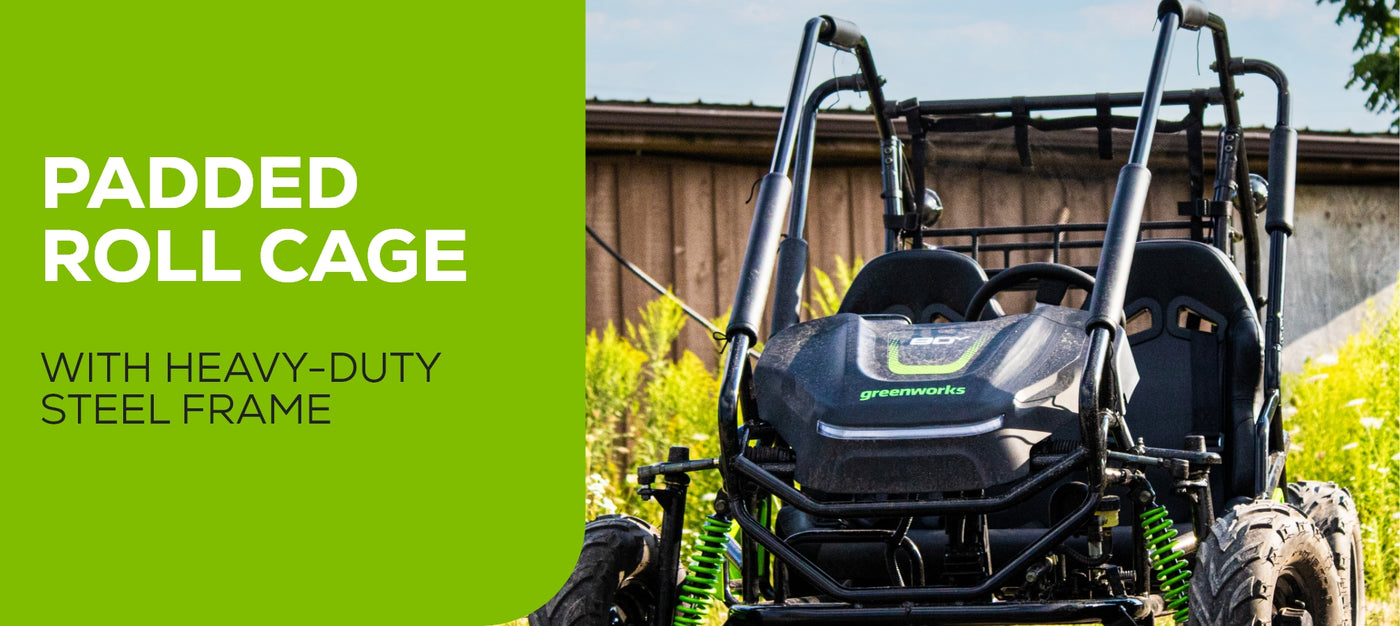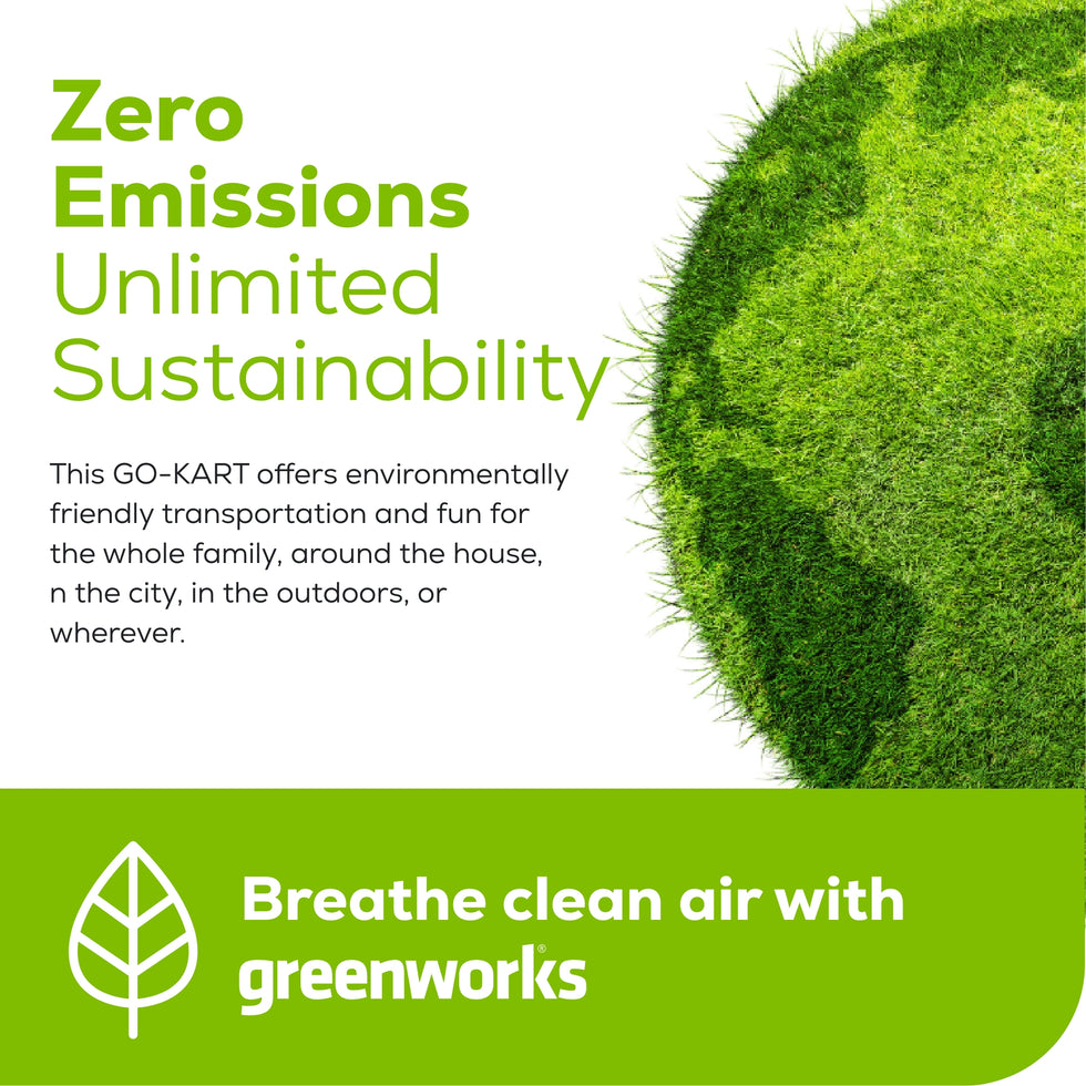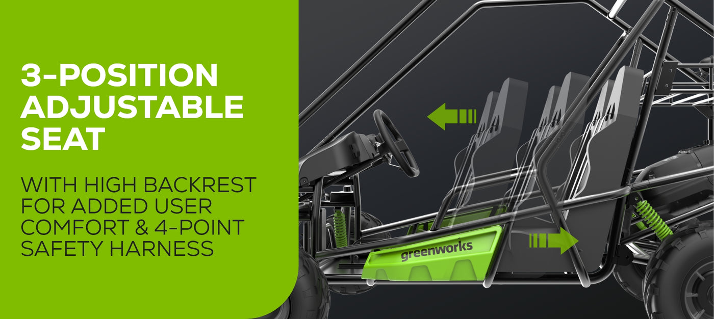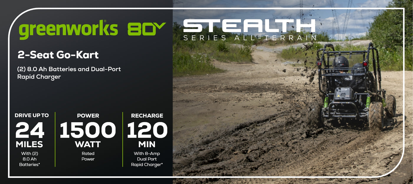 Welcome to a Life. Powered. by Greenworks. Embrace the future of E-Mobility with Greenworks, where innovation meets adventure. The Greenworks 60V STEALTH Series All-Terrain 2-Seat Electric Youth Go-Kart is equipped with a powerful 2400W max dual-hub brushless motor, effortlessly propelling you up to 25MPH in sport mode. Its 16” all terain tires, combined with front and dual rear shocks, provide excellent traction and shock absorption—conquering any terrain while delivering a smooth, stable, and comfortable ride. With a 1-year tool warranty and 4-year battery warranty, you can ride with confidence and peace of mind. Embrace the thrill of the outdoors and redefine your journey with Greenworks!