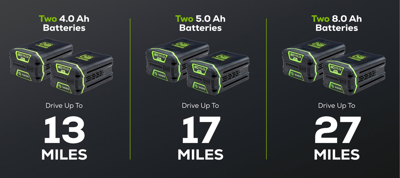 • [FEATURES] Dual Bluetooth speakers and battery ports. Eco Mode extends ride up to 20 miles (32 KM) with two 8.0Ah batteries.