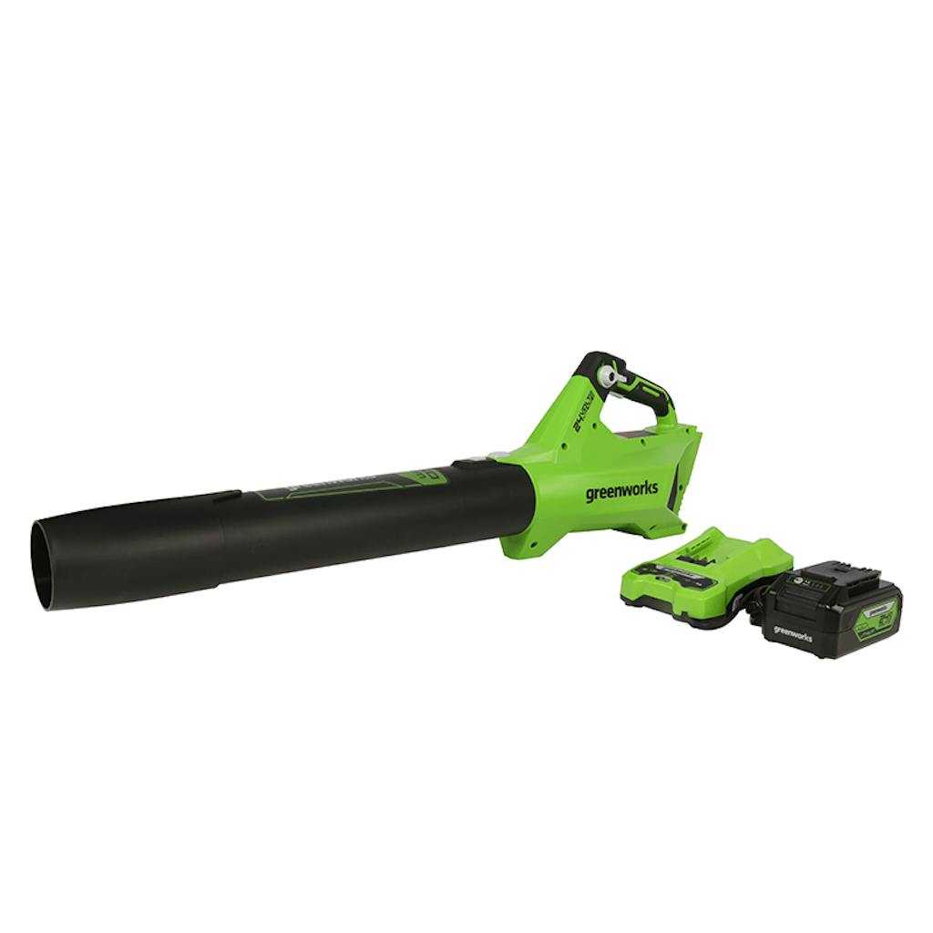 Welcome to a Life. Powered. by Greenworks. The Greenworks 24V POWERALL™ lithium-ion platform powers 125+ indoor and outdoor products, including lawnmowers, blowers, string trimmers, chainsaws, power tools, and more! Our 24V lithium-ion battery provides 20% more power and 35% more runtime, delivering fade-free performance with no memory loss after charging. It also includes a convenient built-in USB port, allowing you to charge your devices on the go. This compact, lightweight leaf blower starts with the squeeze of a trigger, eliminating the need for an aggravating pull cord. Plus, there's no hassle of spilling, mixing, or storing oil and fuel. The Greenworks 24V cordless handheld blower provides powerful clearing performance with 450 CFM airflow and 110 MPH airspeed. Featuring a comfort grip handle, variable speed trigger, and cruise control, this blower is sure to impress. Backed by a 3-year warranty, this unit is built to last for years to come.
