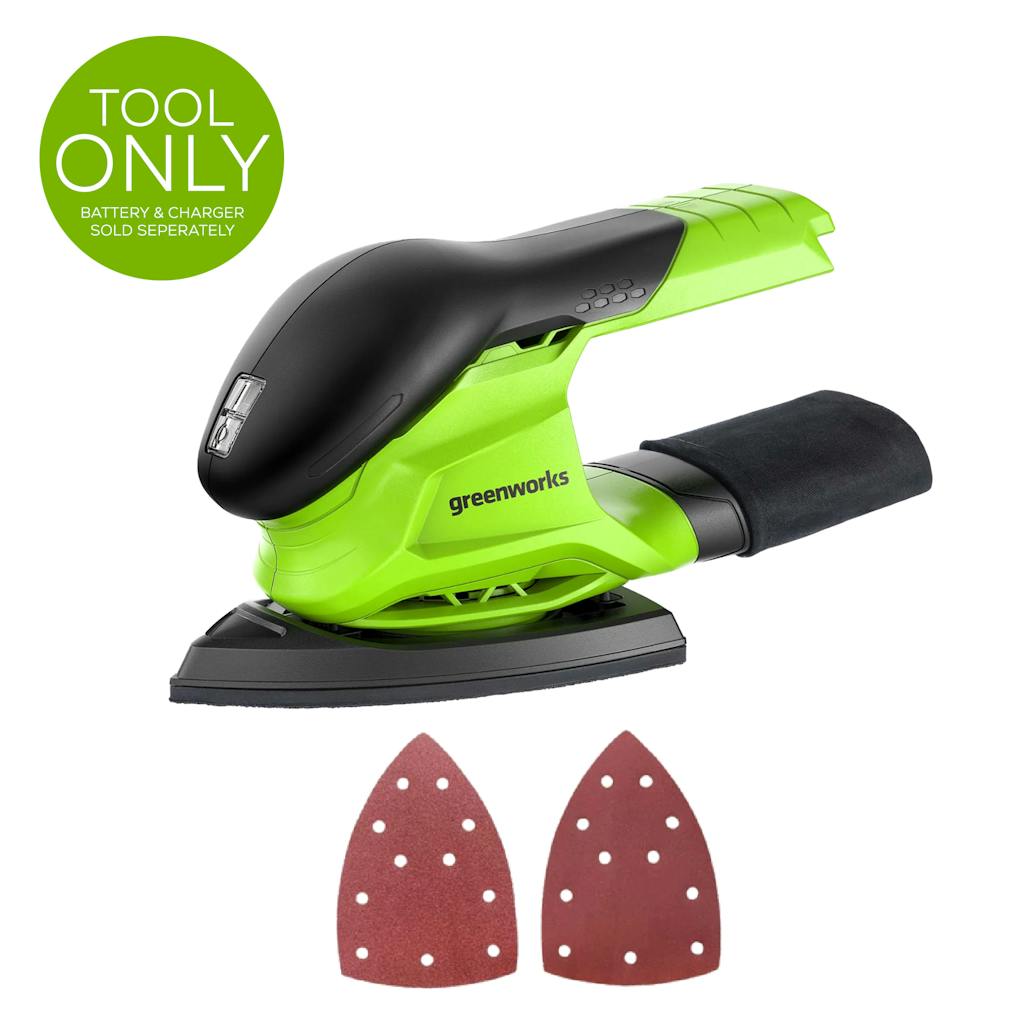 The 24V Cordless Corner Finishing Sander is a single speed sander that features an orbital stroke rate of 22,000 OPM and an orbit diameter of 0.03ins. This sander allows you to quickly and aggressively remove unwanted scratch marks or swirls when sanding, resulting in a great surface finish. Greenworks' 24V POWERALL™ battery platform powers a family of over 200+ tools for both indoor and outdoor use.
