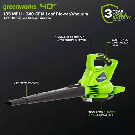 40V 185 MPH - 340 CFM Brushless Leaf Blower / Vacuum, 4.0Ah Battery and Charger Included - 24222