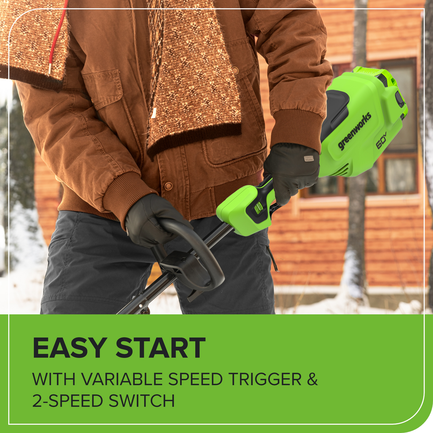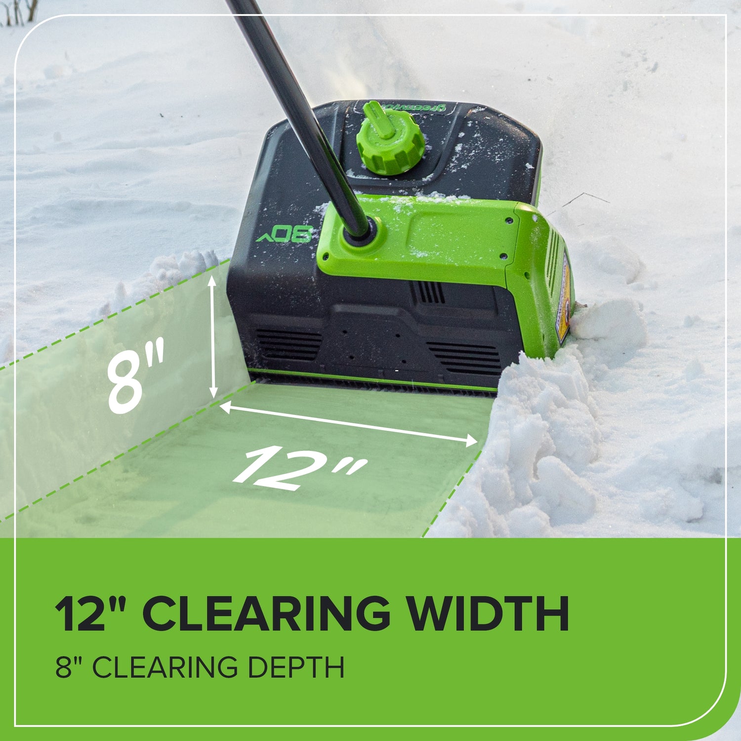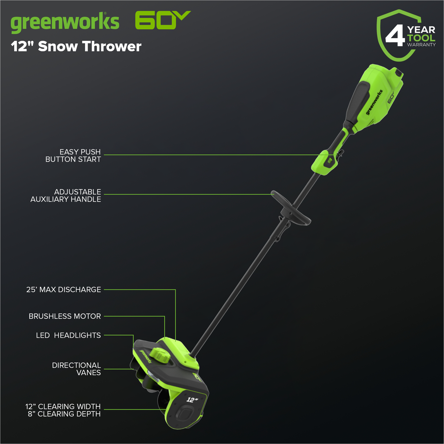 Welcome to a Life. Powered. By Greenworks. Make clearing sidewalks and driveways easier this winter with the Greenworks 60V 12" Brushless Snow Shovel. Built with a high-efficiency 2.0kW brushless motor and a two-speed impeller providing speeds up to 1800 RPM, this snow shovel is sure to impress. Bright LED lights and quiet operation make it convenient for use early in the morning or late at night. Powered by an 60V lithium-ion battery, it features a clearing width of 12" and clearing depth of 8”. Say goodbye to gas this winter and hello to Greenworks. This snow shovel is compatible with the Greenworks 60V system of 75+ tools and batteries. The Greenworks 60V line is accompanied by a 4-year limited warranty, ensuring the safeguarding of your investment.