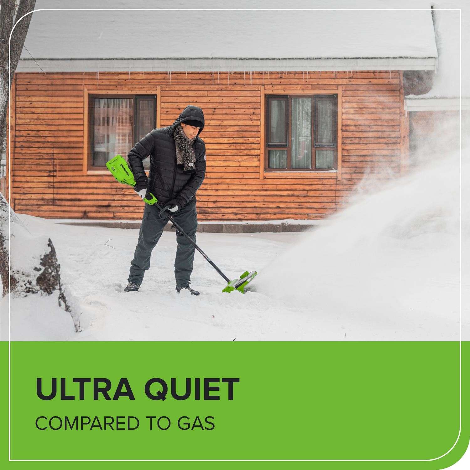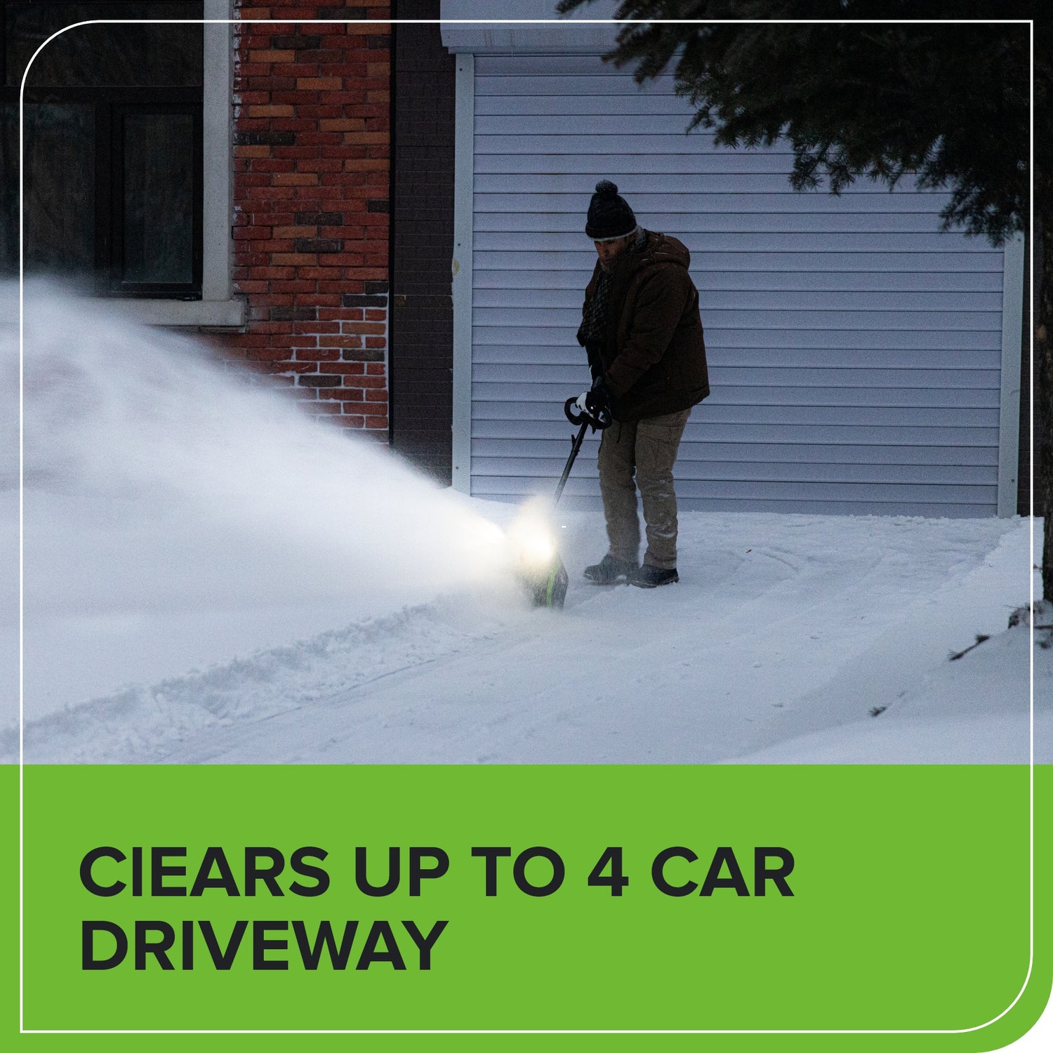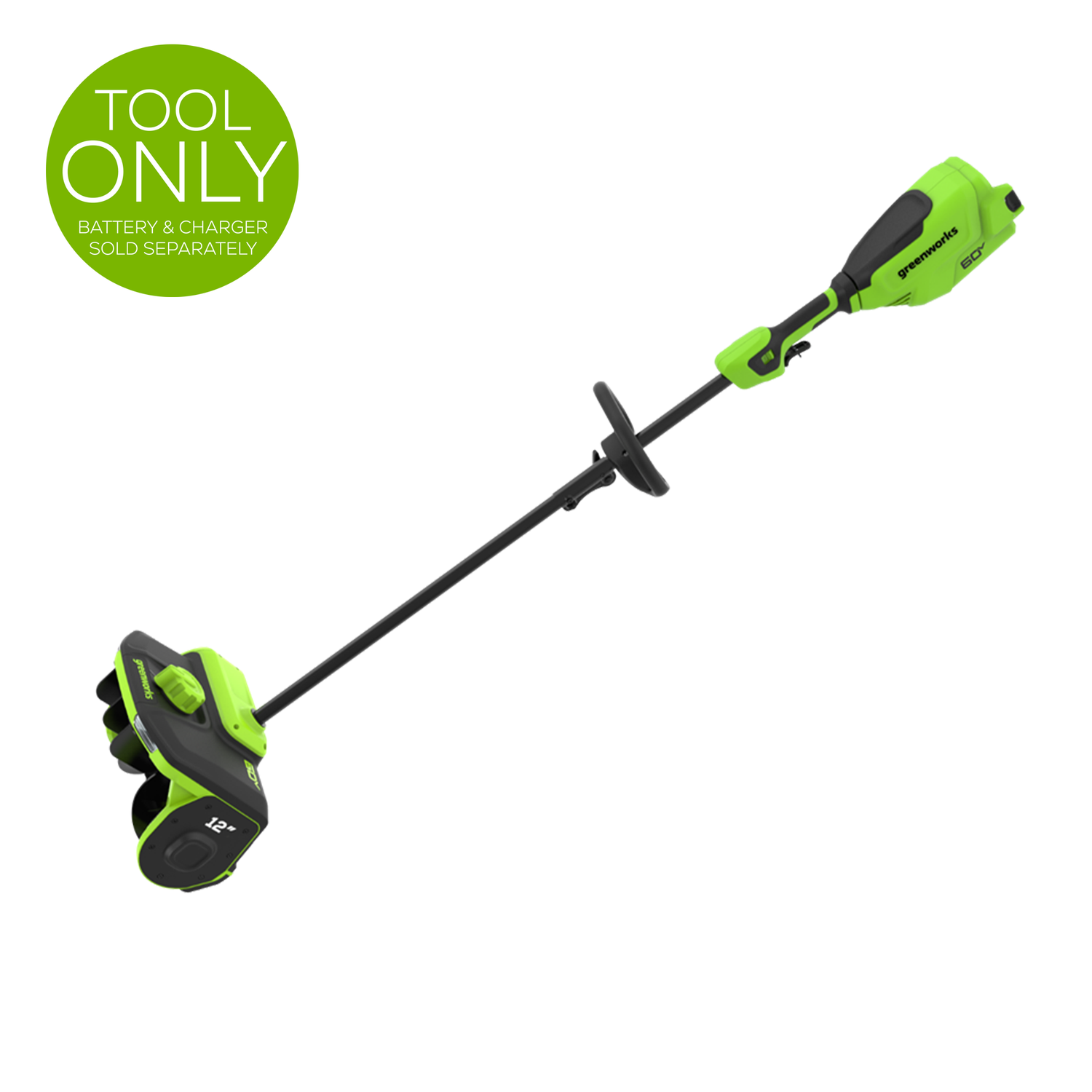 Welcome to a Life. Powered. By Greenworks. Make clearing sidewalks and driveways easier this winter with the Greenworks 60V 12" Brushless Snow Shovel. Built with a high-efficiency 2.0kW brushless motor and a two-speed impeller providing speeds up to 1800 RPM, this snow shovel is sure to impress. Bright LED lights and quiet operation make it convenient for use early in the morning or late at night. Powered by an 60V lithium-ion battery, it features a clearing width of 12" and clearing depth of 8”. Say goodbye to gas this winter and hello to Greenworks. This snow shovel is compatible with the Greenworks 60V system of 75+ tools and batteries. The Greenworks 60V line is accompanied by a 4-year limited warranty, ensuring the safeguarding of your investment.
