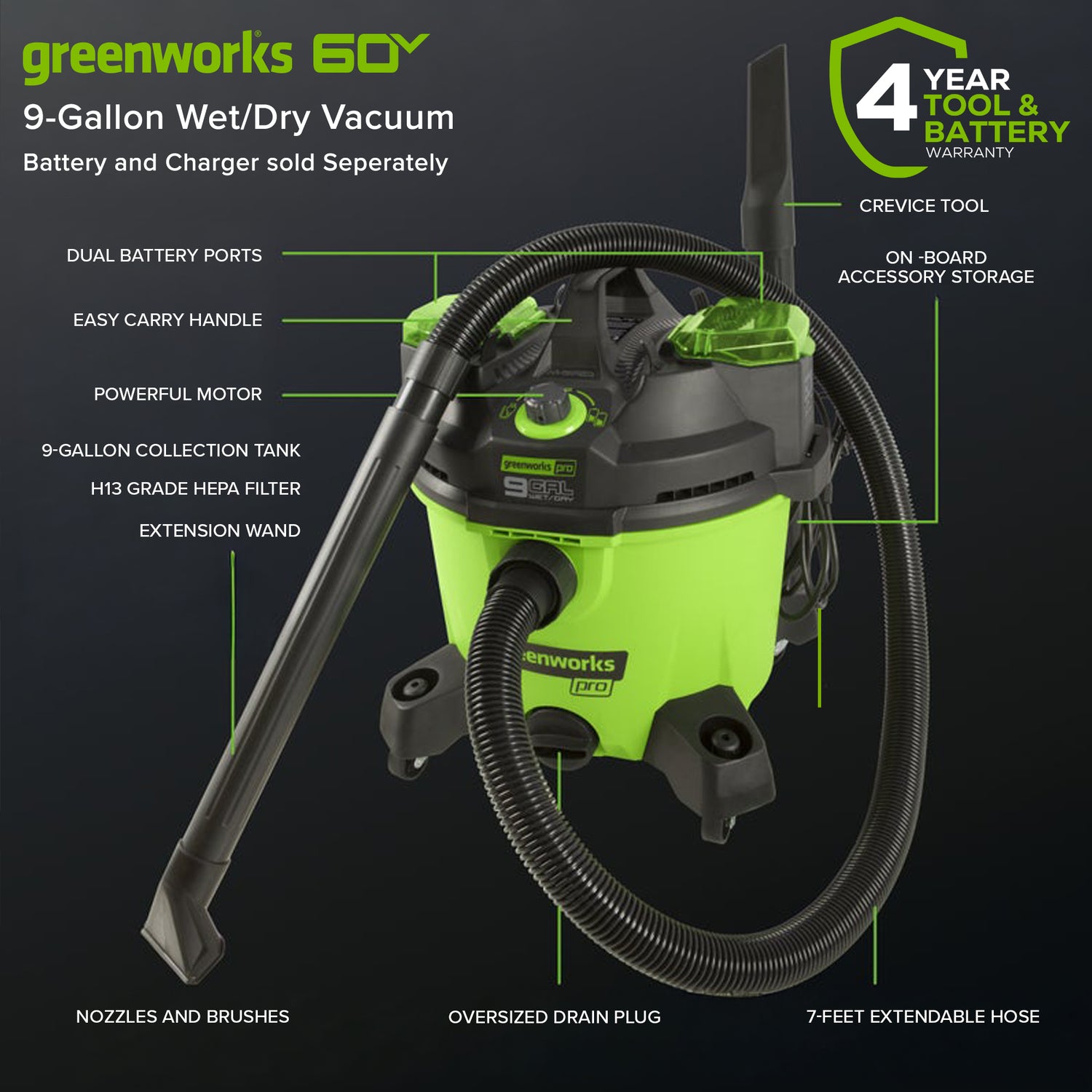 - Powered by an interchangeable Pro 60V lithium-ion battery for reliable, long-lasting power - battery fits all Greenworks Pro 60V tools - AC/DC backup cord integrated