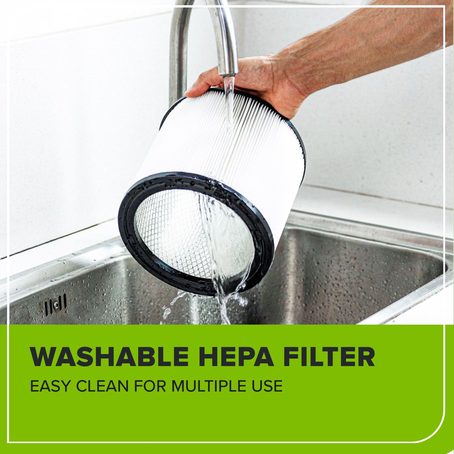 This model uses a HEPA filter, which efficiently captures particles above 0.5μm.