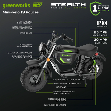 60V STEALTH Series Electric Mini-Bike, (2) 8.0Ah Batteries and Dual-Port Rapid Charger Included