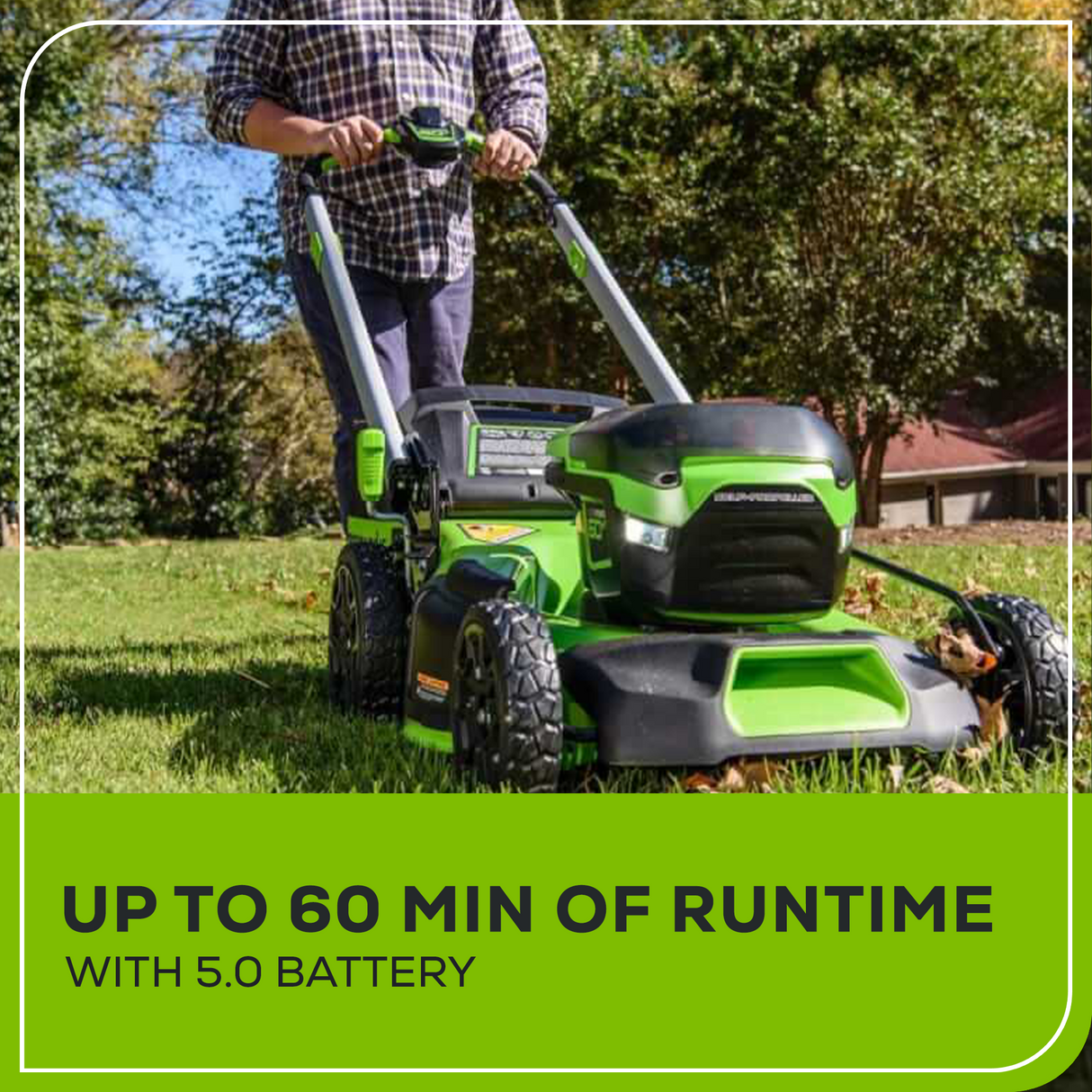 [SEAMLESS DUAL BATTERY SYSTEM] When one battery depletes, the mower's power supply automatically switches to the second battery, seamlessly doubling your runtime without manual swapping. Up to 60 minutes of runtime and 60-minute charge time keeps your battery lawn mower ready for action.