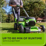 Welcome to a Life. Powered. by Greenworks. When it comes to outdoor power equipment, you put the emphasis on "power." And why not? For homeowners like you who take on jobs big or small, you need a cordless battery lawn mower with heavy grade construction and long-lasting peak performance. The Greenworks 60V battery lawn mower family meets the challenge with a universal battery system that works across multiple products, high-efficiency brushless motors, and cutting edge features. Kick gas to the curb and go green with this eco-friendly battery-powered lawn mower that delivers no fumes, no mixing, no maintenance, and no pull cords. Let Greenworks help you take the work out of yard work. Keep your lawn pristine with the Greenworks 60V 21" Brushless Self-Propelled Battery Lawn Mower, complete with 5.0Ah battery and rapid charger for extended runtime. This powerful electric battery lawn mower features a durable steel deck, 7 cutting heights, innovative SmartCut technology that automatically adjusts power based on grass thickness, Turbo Mode for thick grass, and folding handles for compact storage. Plus, all Greenworks 60V battery lawn mowers feature a 4 Year Limited Tool & Battery Warranty to ensure your investment is protected.