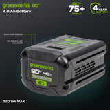 Take your Greenworks Pro 80V tools to the next level with this high-capacity, 4.0 Ah Lithium-Ion Battery. It delivers fade-free power with a faster charge, more power & more runtime. The Greenworks lineup features 75+ high-performance Pro 80V tools, allowing you to ditch your gas tools for an innovative, eco-friendly alternative.