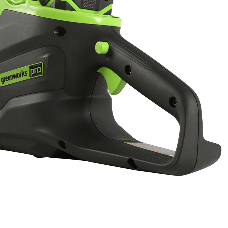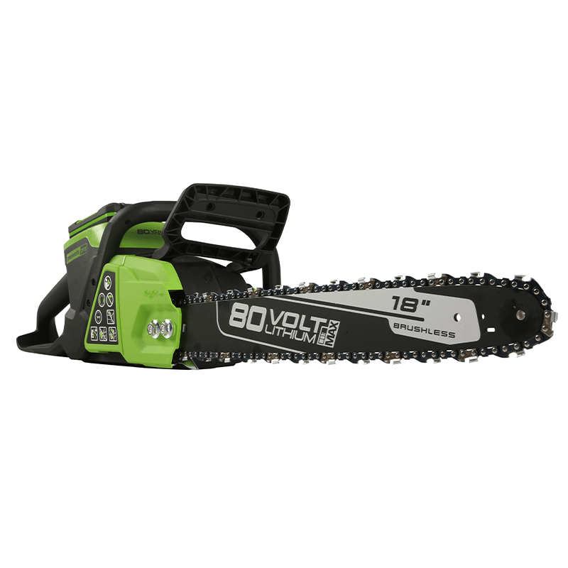 Welcome to a Life. Powered. by Greenworks. Powered by a Greenworks Pro 80V lithium-ion battery, this cordless chainsaw delivers the power and performance of gas without the noise, fumes, or harmful emissions. The high-efficiency brushless motor provides greater torque, longer runtimes, and faster cutting performance, featuring our No Prime, No Choke, No Pull easy-starting system for instant starts every time. This lightweight chainsaw includes an 18-inch bar and chain, pro-style side-mounted chain tensioning for easy maintenance, automatic chain oiler, transparent oil fill window, and a chain brake for added safety. The Greenworks Pro 80V battery platform gives you all the power you need to tackle tough yard projects—so you can kick gas to the curb and go green with no fumes, no mixing, no maintenance, and no pull cords. Backed by a 4-year tool and battery warranty, this chainsaw is built to last.