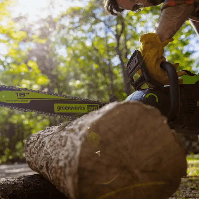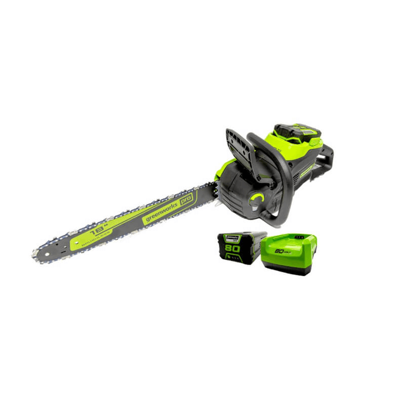 The Greenworks lineup features a variety of high-performance 80V tools that allow you to ditch your gas tools for an innovative, eco-friendly alternative. This Greenworks 80V 18" Brushless Chainsaw has the equivalent power of a 45cc gas engine, without the hassle of gas and fumes. This chainsaw starts at the push of a button and can make up to 150 cuts through a 4" x 4" piece of pressure treated lumber in one single charge of the 80V 2.0 Ah battery (included). The quick charger will recharge the battery in approximately 30 minutes, putting you back to work in no time.