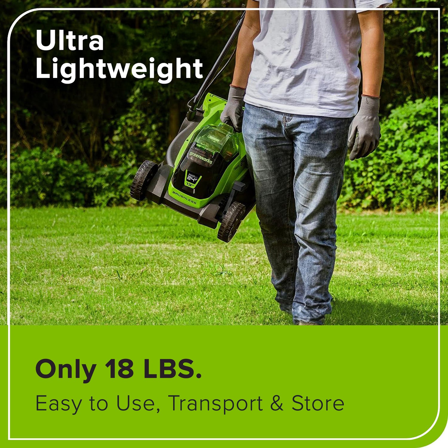 Welcome to a Life. Powered. by Greenworks. The Greenworks 24V PowerAll™ lithium-ion platform powers over 125+ indoor & outdoor 24V products, including lawnmowers, blowers, string trimmers, chainsaws, power tools and more! Our 24V batteries provide 20% more power and 35% more run-time, and deliver fade-free power with no memory loss after charging. Kick gas to the curb and go green with no fumes, no mixing, no maintenance, and no pull cords. Let Greenworks help you take the work out of yard work. Keep your lawn looking incredible with the Greenworks 24V 13" Brushless push Lawn Mower, 4.0Ah Battery and Charger. This cordless battery operated lawnmower features a poly deck, 5 cutting heights, innovative SmartCut technology, push button start and folding handles for compact storage. When looking for tools and outdoor power equipment, we know you’re thinking about quality. That’s why Greenworks backs our 24V tools with a 3 Year Limited Tool & Battery Warranty.