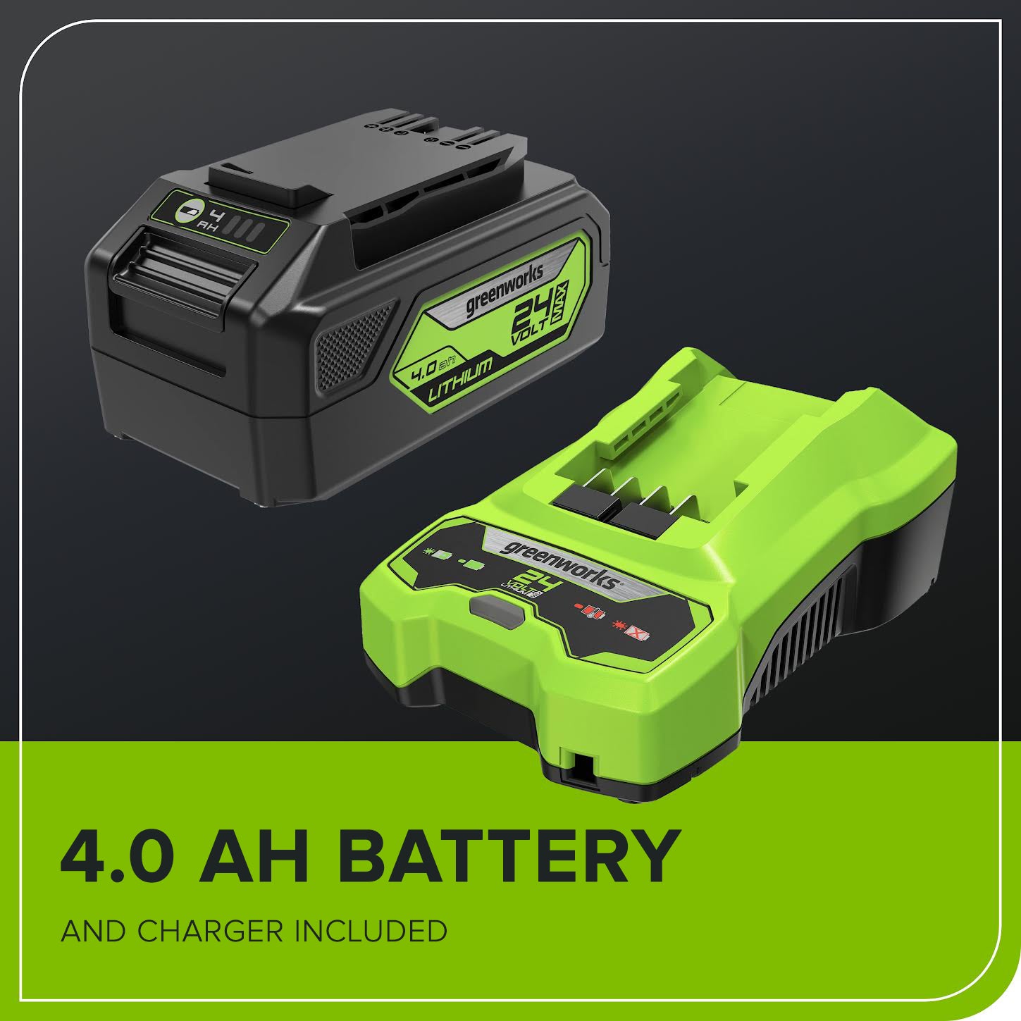 - NEVER STOP CUTTING Individual battery port to accept all your Greenworks 24V batteries. Up to 40 minutes of runtime and a charge time of 120 minutes.
