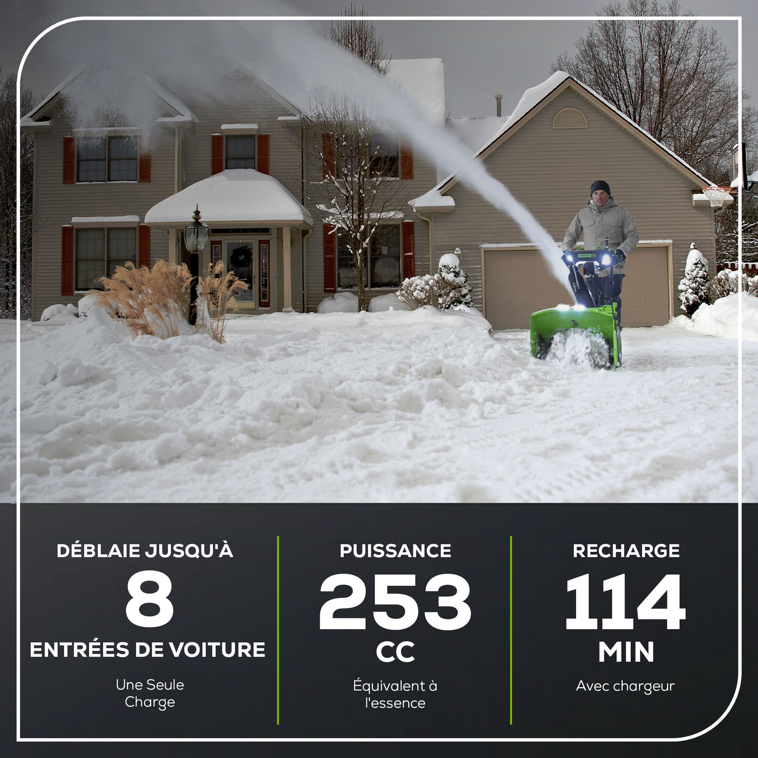 Our single-stage snow thrower kits are often supplied with enough battery capacity to cover the average 4-car driveway. It is important to note that the overall run time received is ultimately determined by the load acting against the unit and will fluctuate.
