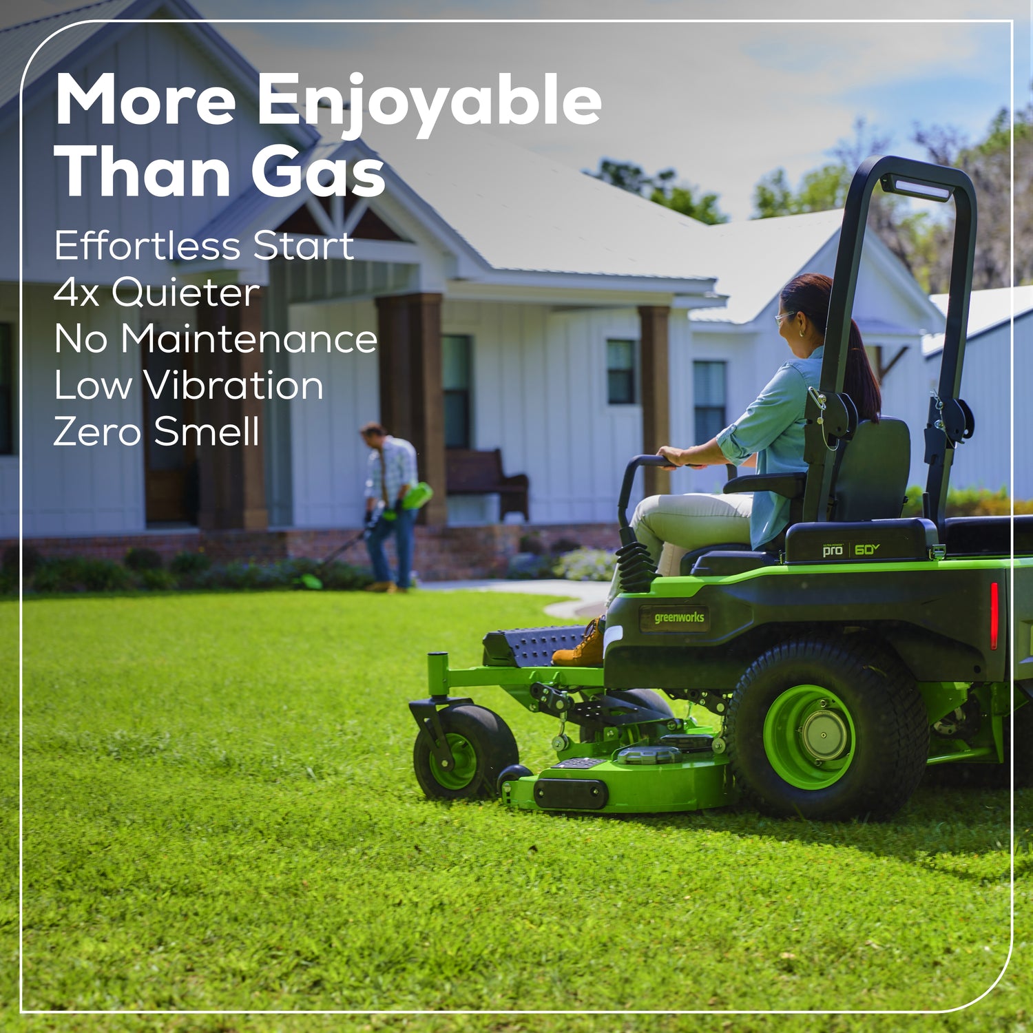 Experience powerful, cordless zero-turn performance with the Greenworks 60V 60" Zero-Turn Riding Mower. Designed to deliver precise control and efficient cutting without gas, fumes, or maintenance, this zero-turn mower combines high-torque brushless motor technology with a wide 60-inch cutting deck for fast, confident mowing. Featuring multiple drive speeds, onboard charging capability, and compatibility with Greenworks 60V batteries—including suitcase battery support—this ZTR delivers smooth operation and professional-level results. With LED headlights for improved visibility and stable performance on slopes up to 15°, the Greenworks 60V 60" Zero-Turn mower is built to handle demanding residential mowing with ease. Backed by a 4-Year Limited Warranty, Greenworks delivers riding performance you can trust.