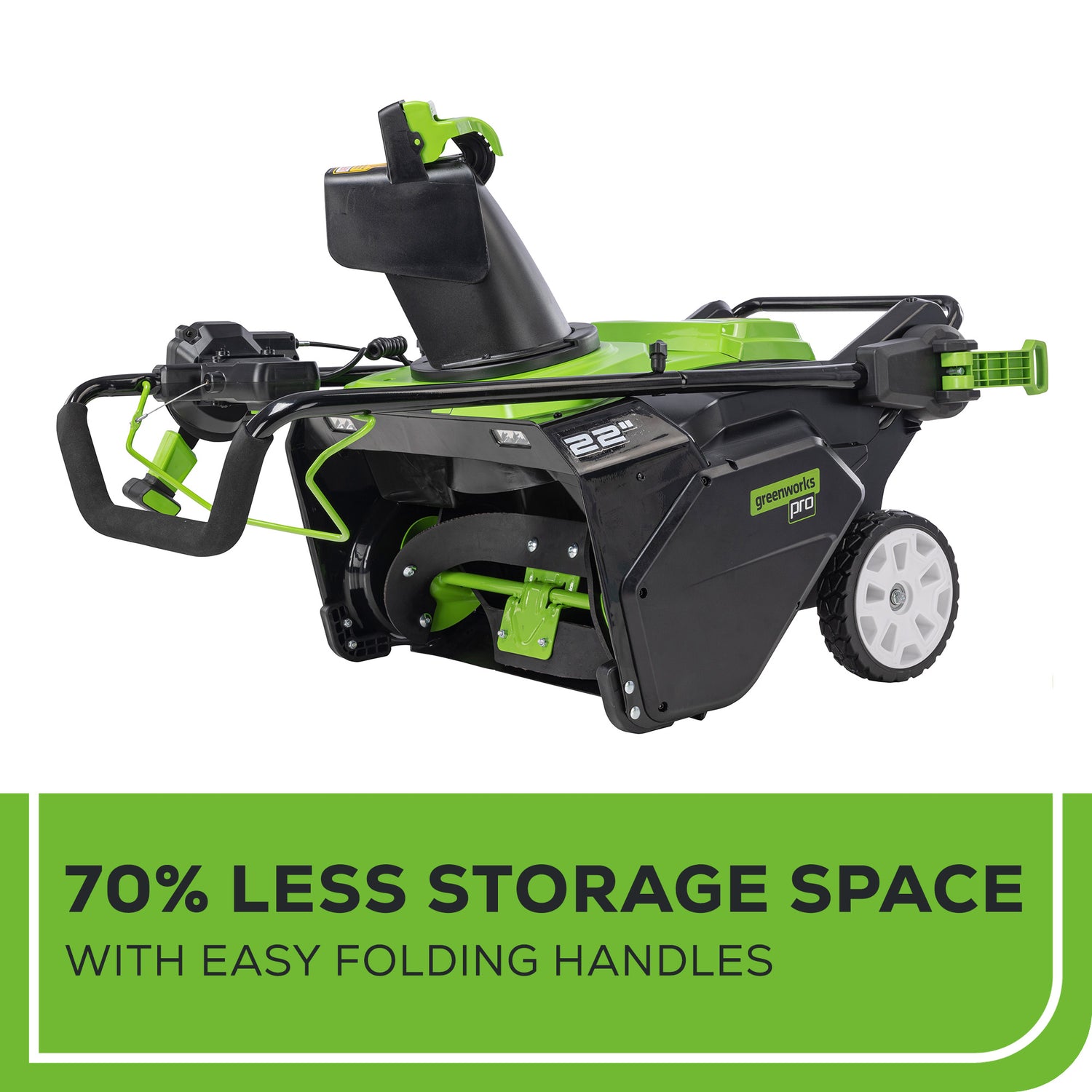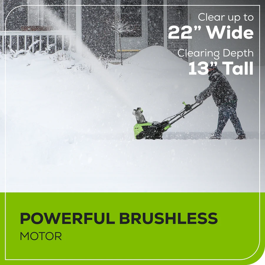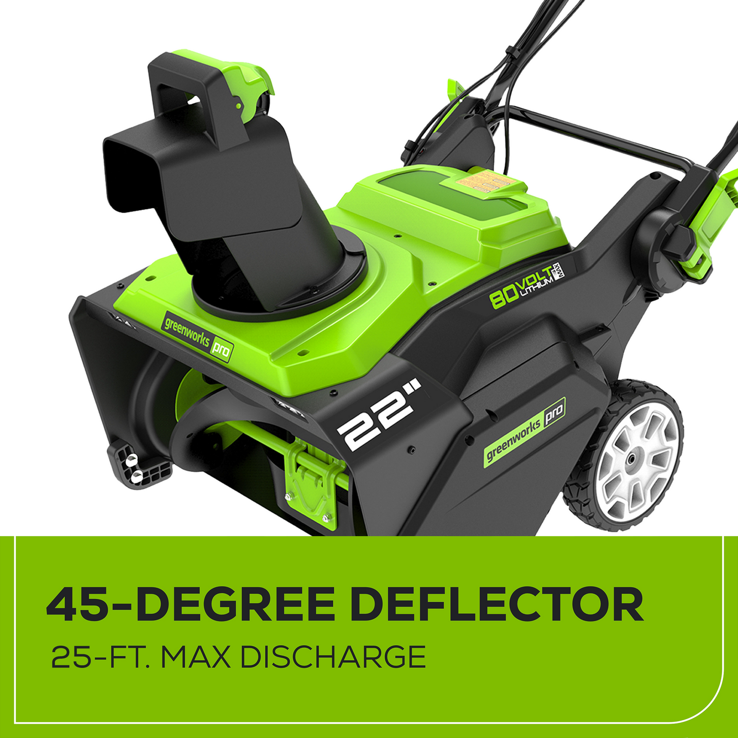 Welcome to a Life. Powered. By Greenworks. Ideal for clearing snow from sidewalks, driveways, and patios, this Greenworks Pro 80V snow blower is the tool to have when the snow hits. Built with a high-efficiency brushless motor and a 22" wide intake, the Greenworks Pro 80V Cordless Snow Blower can handle it all. Easily adjust the auger to control how far the snow is thrown for maximum control. A robust handle-mounted chute-adjustment lever puts the user in control when re-directing the snow up to 180° from side to side. Bright LED lights make it convenient for use early in the morning or at night and the robust steel chassis is built for aggressive use in demanding conditions. Say goodbye to gas this winter and hello to Greenworks. This snow thrower is compatible with the complete Greenworks 80V system of tools and batteries. Start with a tool kit then add tool-only equipment. The Greenworks Pro 80V line is accompanied by a 4-year limited warranty, ensuring the safeguarding of your investment.