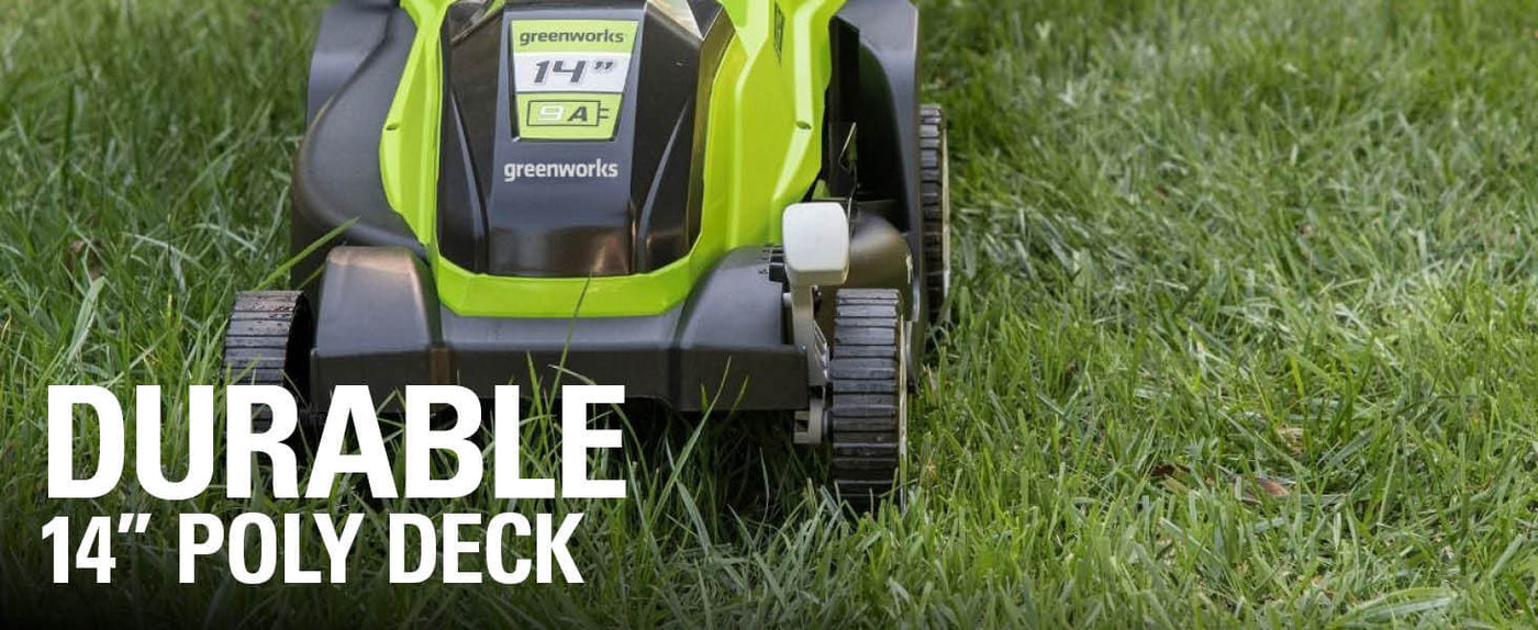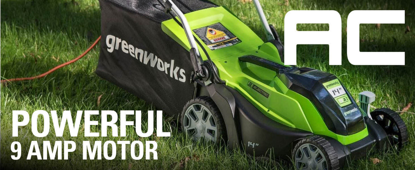 Welcome to a Life. Powered. by Greenworks. Kick gas to the curb and go green with this compact electric lawn mower! With Greenworks electric outdoor power equipment giving you all the power you need to tackle your yard, you can now breeze through jobs with zero gas, zero emission, and zero maintenance. Go from zero to power with a push of a button and get through the task at hand with less vibration, less noise and less mess. Corded power with unlimited runtimes means this electric lawn mower can get all of your landscaping done with all the power performance of gas while at a lower cost of operation. Never stop cutting with the Greenworks 9 Amp 14" Corded Push Electric Lawn Mower. This lightweight corded electric lawn mower features a rust-proof poly deck, 5 cutting heights for precise lawn care, push button start for instant power, and folding handles for space-saving storage. Perfect for small lawns and tight spaces, this compact electric lawn mower delivers consistent 9 Amp power without battery charging or gas mixing. Plus, all Greenworks corded electric lawn mowers feature a 3 Year Limited Tool Warranty to ensure your investment is protected.