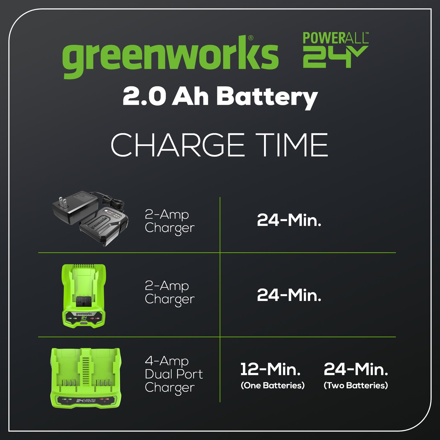 The Greenworks 24V POWERALL™ lithium-ion platform powers over 50 indoor and outdoor products, including lawn mowers, blowers, string trimmers, chainsaws, power tools, and more! The 24V lithium-ion battery provides 20% more power and 35% more run-time, and delivers fade-free power with no memory loss after charging. The outdoor power equipment allows you to tackle up to 1/4 acre with the available 1.5Ah, 2Ah, and 4Ah batteries. USB ports are integrated into the BAG711, BAG708, and BAG709 batteries, making it a portable charger for phones, tablets, and other compatible electronic accessories. The Greenworks 24V POWERALL™ platform comes with a 3 year tool / battery warranty to protect your investment.