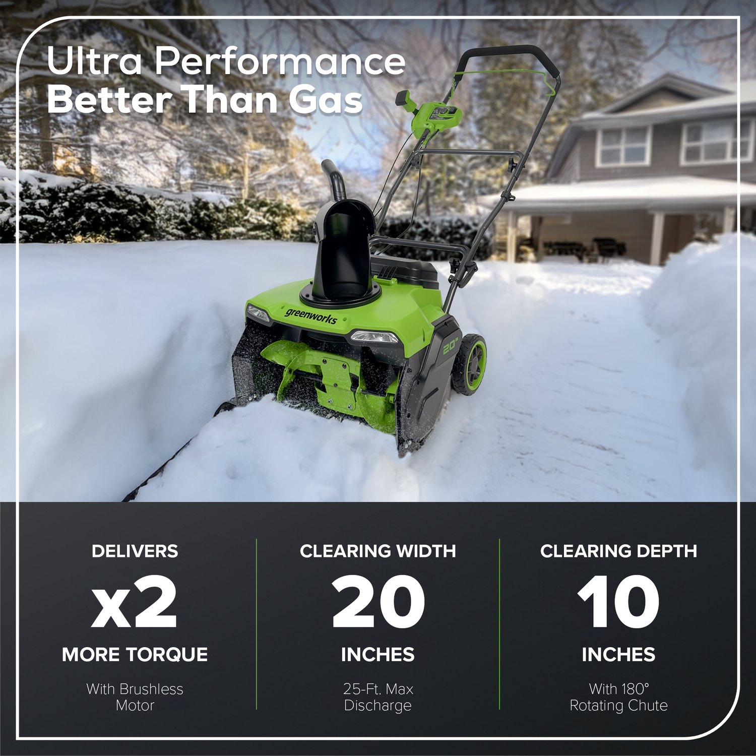 Welcome to a Life. Powered. By Greenworks. Take the hassle out of winter with the Greenworks 48V (24V x 2) 20" Brushless Snow Thrower, perfect for clearing sidewalks, driveways, and patios. Runs on two 24V batteries (sold separately) for cordless convenience, and clears a 20" wide by 10" deep path with its 3-speed steel auger built for durability. Compatible with all Greenworks 24V batteries—for best results, use 4.0Ah or higher—it features a 180° chute rotation lever that throws snow up to 25', with a design that reduces leakage. Dual LED lights brighten your path, while rubber-tread wheels and a 2-position adjustable handle make maneuvering effortless. The folding handle system provides easy storage and transport. Spend less time shoveling and more time enjoying winter with the Greenworks 24V x 2 Snow Thrower—backed by a 3-year limited warranty.