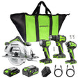 Welcome to a Life. Powered. by Greenworks. Tackle projects with ease using the Greenworks 24V Brushless 4-Piece Power Tool Combo Kit. This versatile kit includes a Drill/Driver, Circular Saw, Impact Driver, and LED Flashlight—perfect for woodworking, DIY projects, and home improvement. Powered by one 4.0Ah and one 2.0Ah USB-C battery, all tools run efficiently with minimal downtime. The included 65W USB-C fast charger ensures quick charging, while the batteries also double as USB-C power banks to charge phones, tablets, or other devices.Brushless motors provide longer runtime, improved efficiency, and enhanced durability across all tools. Backed by a 3-year limited tool and battery warranty, this 4-piece combo kit delivers professional-grade performance for every task.