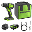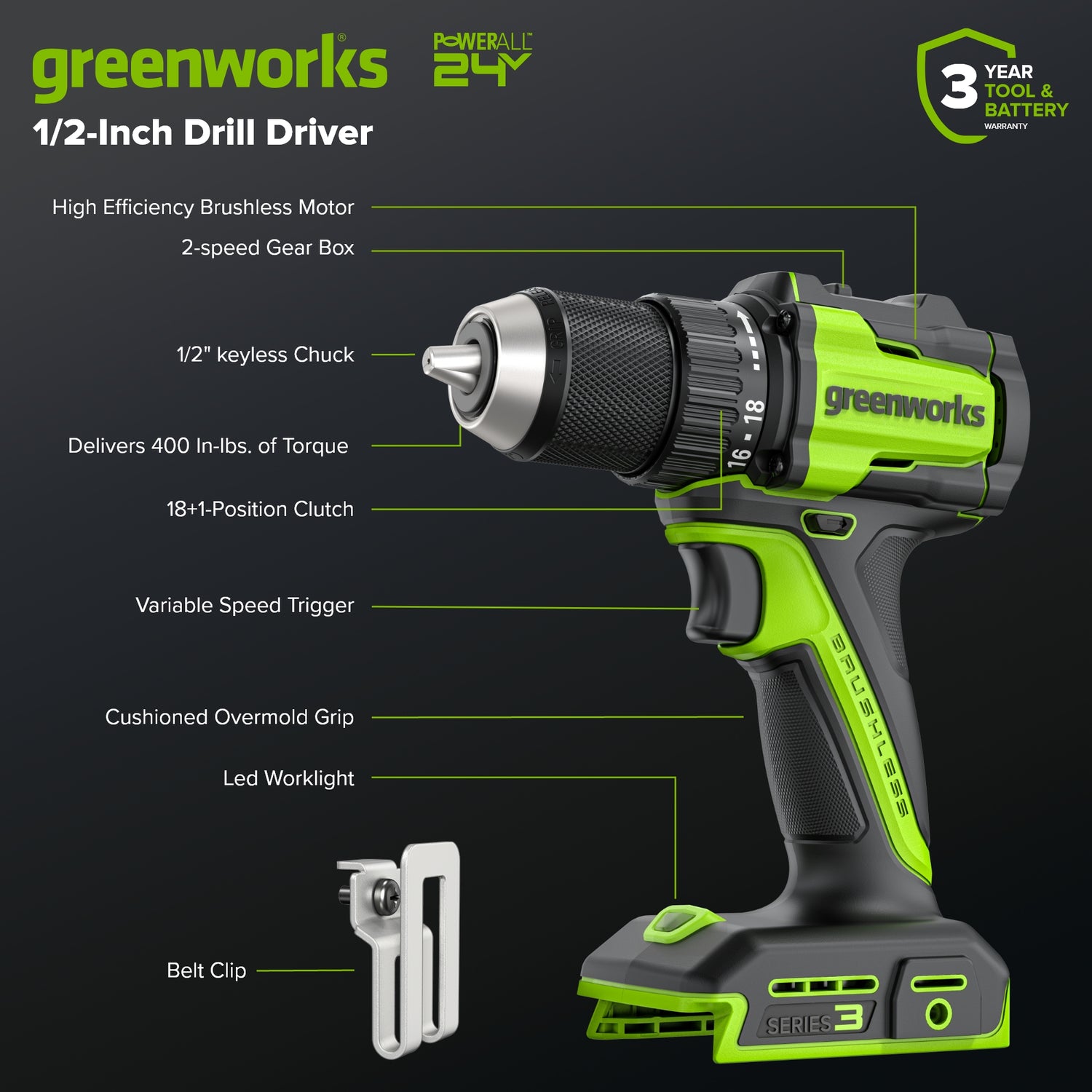 Welcome to a Life. Powered. by Greenworks. Take on any project with confidence using the Greenworks 24V 1/2" Drill Driver. Delivering up to 400 in-lbs of torque and variable speeds from 0–450/0–2,000 RPM, it offers precision control with an 18-position clutch to prevent stripping or over-tightening. The durable 1/2" keyless ratcheting metal chuck allows fast, easy bit changes, while the lightweight design ensures comfort and maneuverability on every job. The included 2.0 Ah USB-C battery powers over 150 Greenworks 24V tools and recharges quickly with the 30W USB-C fast charger. Reliable, versatile, and ready to work—this drill driver is backed by a 3-year limited tool and battery warranty.