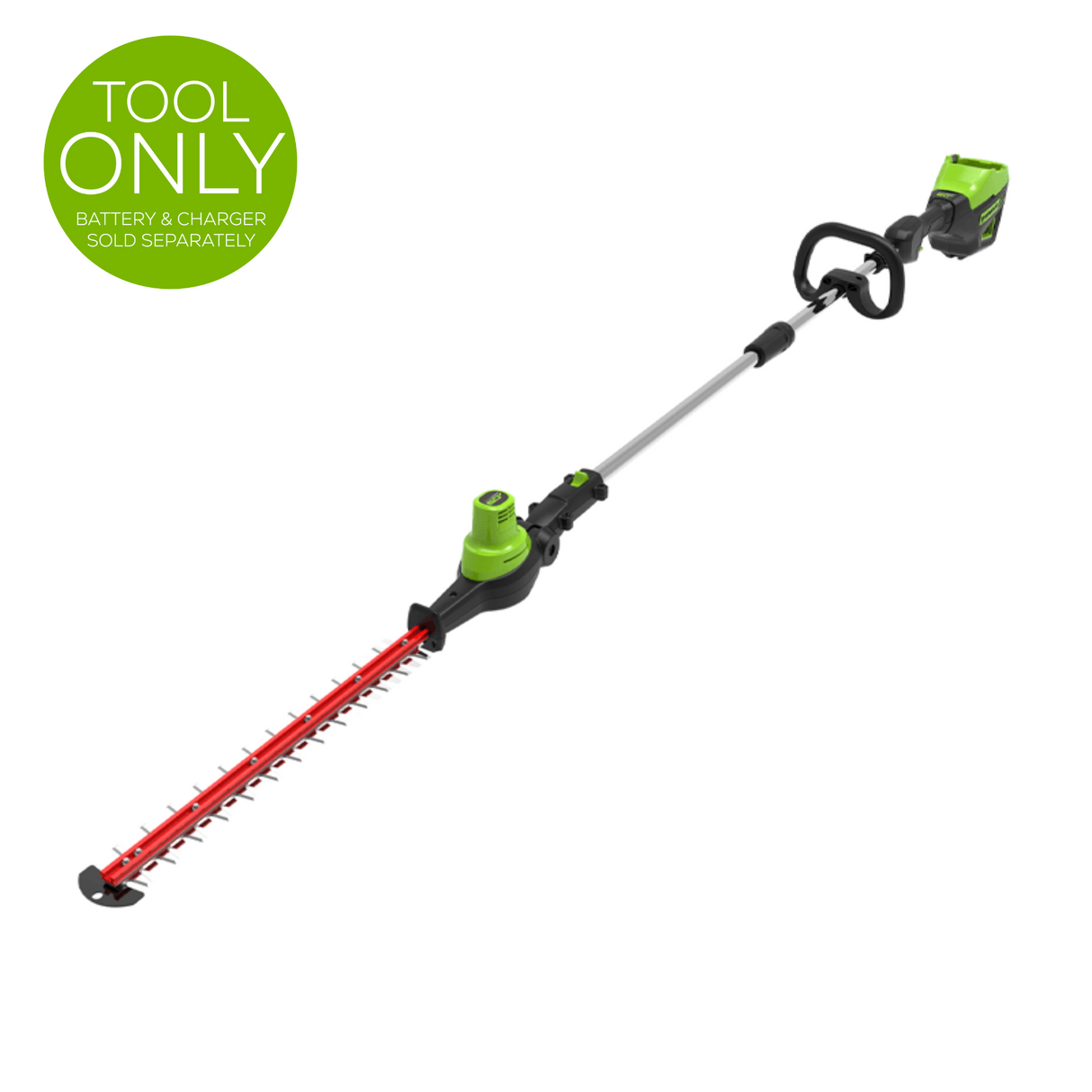 Powered by a Greenworks Pro 60V lithium-ion battery (battery & charger sold separately), this Greenworks Pro cordless pole hedge trimmer is the ideal choice for homeowners who want the convenience and benefits of going cordless for everyday yard work but also the confidence to take on occasionally challenging projects, without the noise, fumes, or harmful emissions. The powerful Greenworks Pro 60V cordless battery platform gives you all the power you need to tackle all your lawn care projects. Kick gas to the curb this spring and go green with no fumes, no mixing, no maintenance and no pull cords. Let Greenworks help you take the work out of yard work.