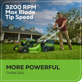 The Greenworks 60V Self-Propelled mower features the most advanced power-cutting system in the industry. Where gas mowers bog down, our mowers sense extreme conditions to send optimal power to the blade motors, maintaining consistent blade speeds of 2,800-3,200 RPM through tall, thick, and wet grass