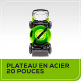 • DURABLE The durable 20-inch steel deck allows you to handle large areas of grass quickly and easily. With 7 different cutting height options, you can ensure the best cut in all environments.