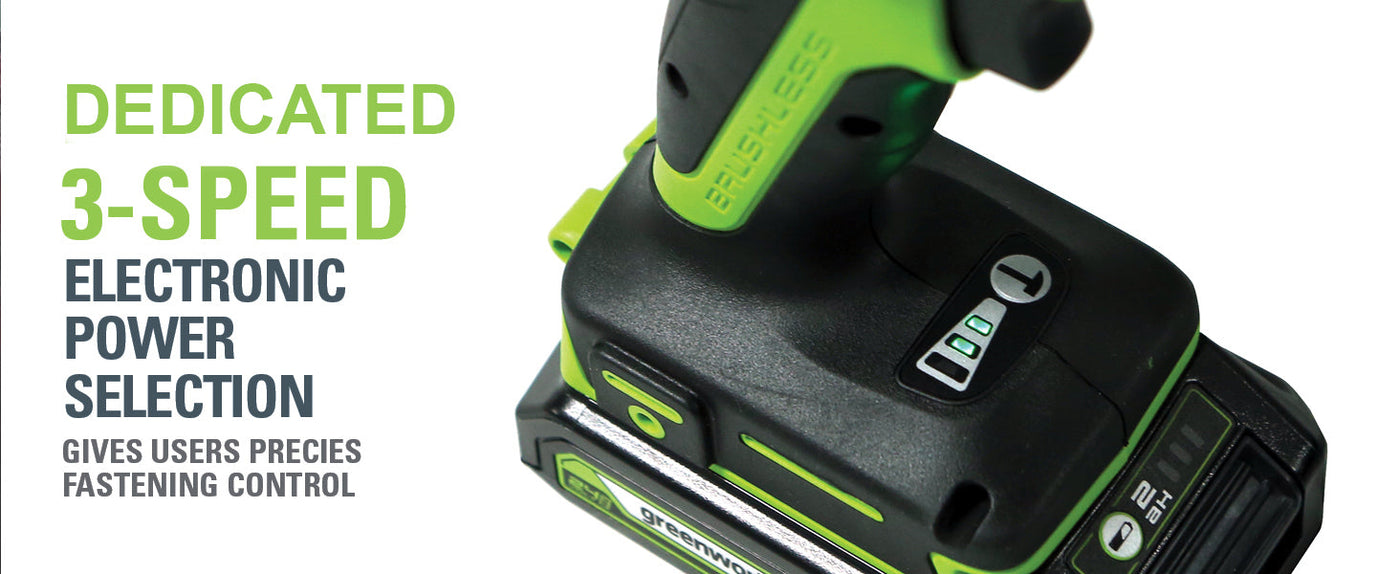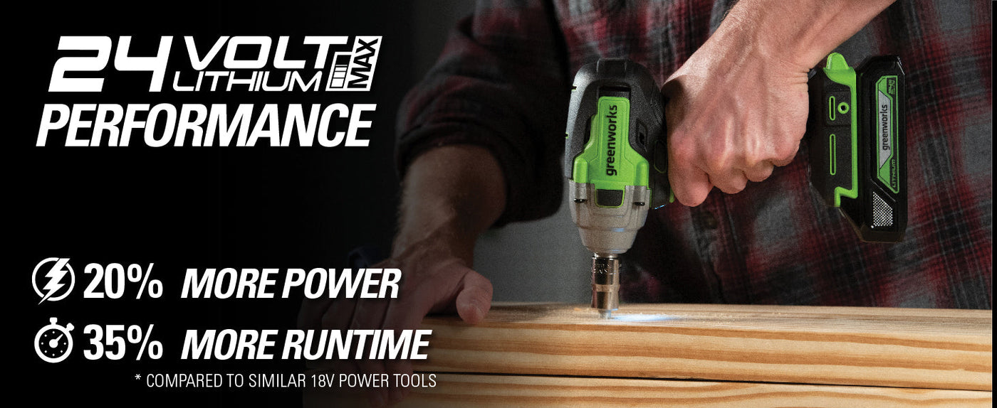 • The Greenworks 24V combo kit is the perfect solution for homeowners looking to make the switch to battery power. It includes a 1/2 in. brushless drill/driver and a 1/4 in. brushless impact driver, both of which are equipped with an LED light, allowing for work at night and in dark spaces. Both tools run on 24-volt lithium batteries with a 3-hour charger included, providing maximum runtime for the sawing, drilling, and hammering you do around your home