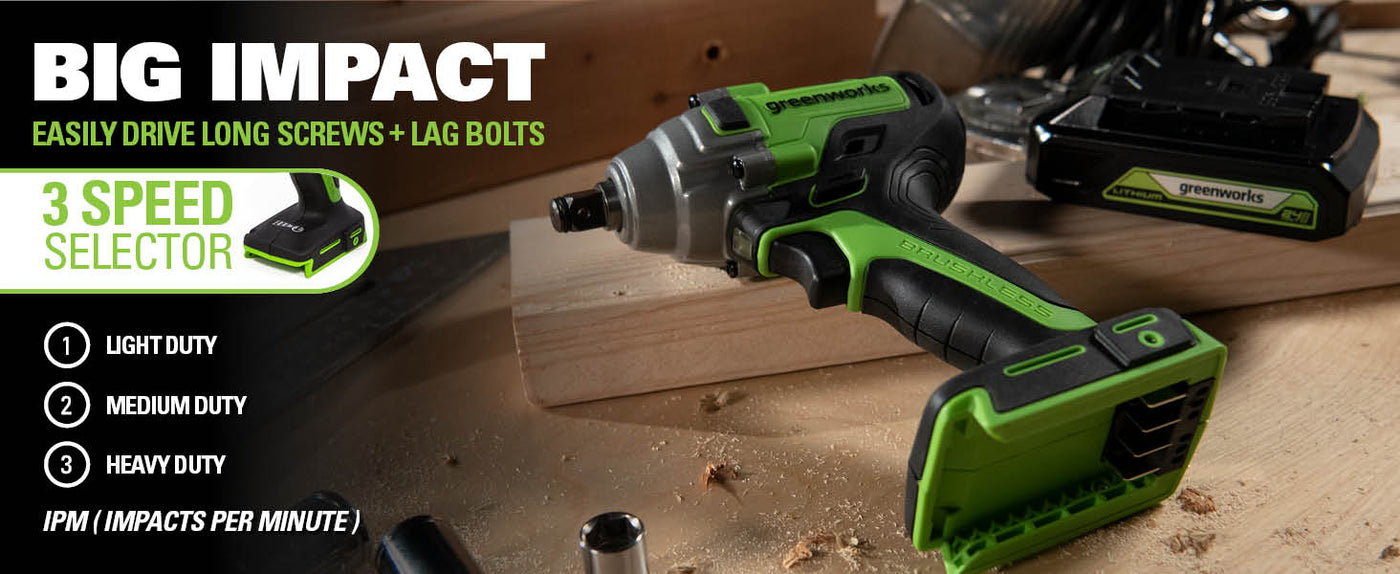The Greenworks 24V POWERALL™ lithium-ion platform powers over 75+ indoor & outdoor products, including lawn mowers, blowers, string trimmers, chainsaws, power tools and more! Our 24V lithium-ion battery provides 20% more power and 35% more run-time, and delivers fade-free power with no memory loss after charging. This power tool features a 1/2" compact impact wrench is ideal for tightening & loosening bolts and nuts, produces up to 540 ft-lbs of torque (0-2800 RPM) to break loose the most stubborn nuts & bolts with 3-speeds to provide power selection for precise fastening control. The Greenworks 24V PowerAll™ platform comes with a 3 Year Limited Tool to protect your investment.