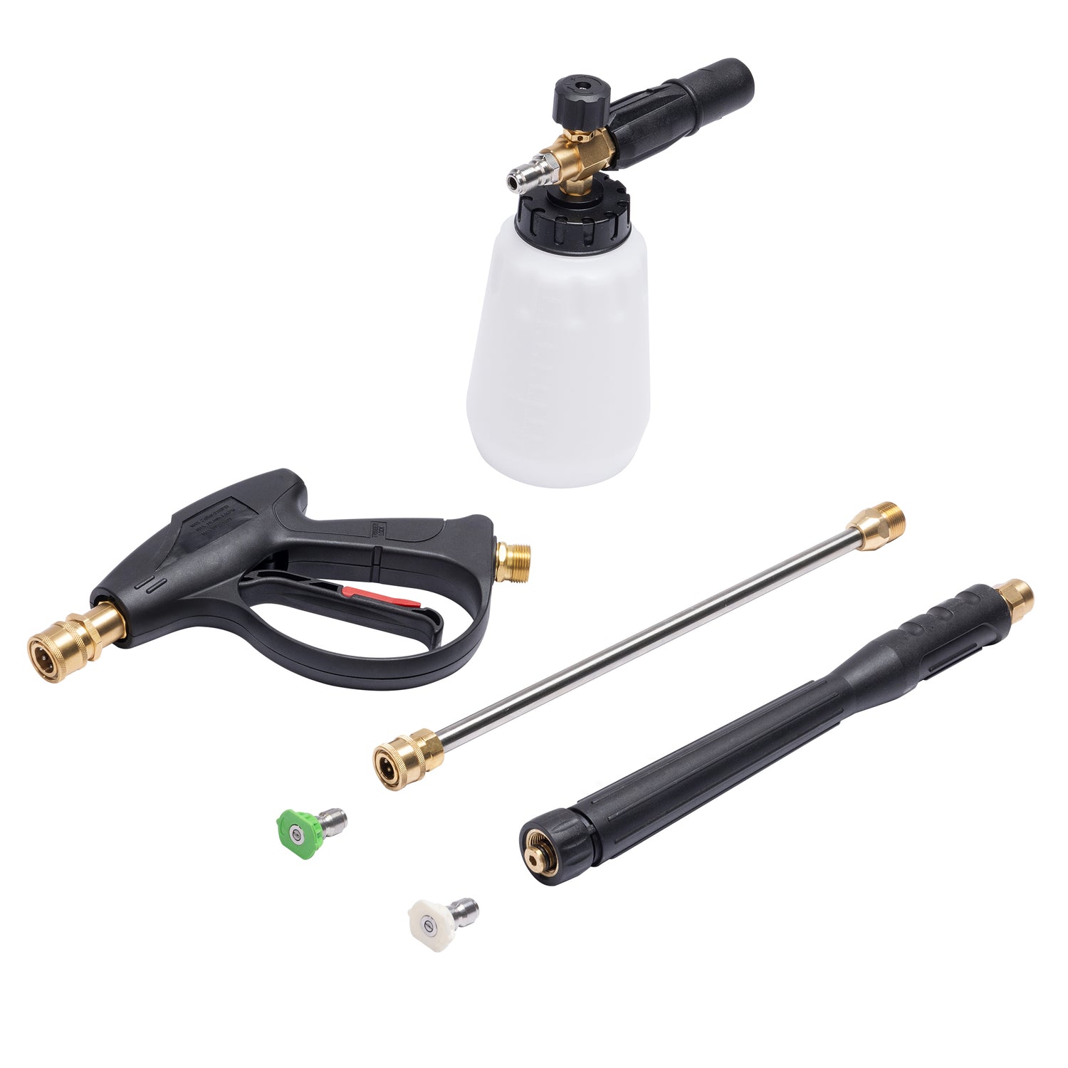 Includes: One (1) Short Gun, One (1) Foam Cannon, One (1) 25 Degree Nozzle, One (1) 40 Degree Nozzle, One (1) 36" Long Gun Extension