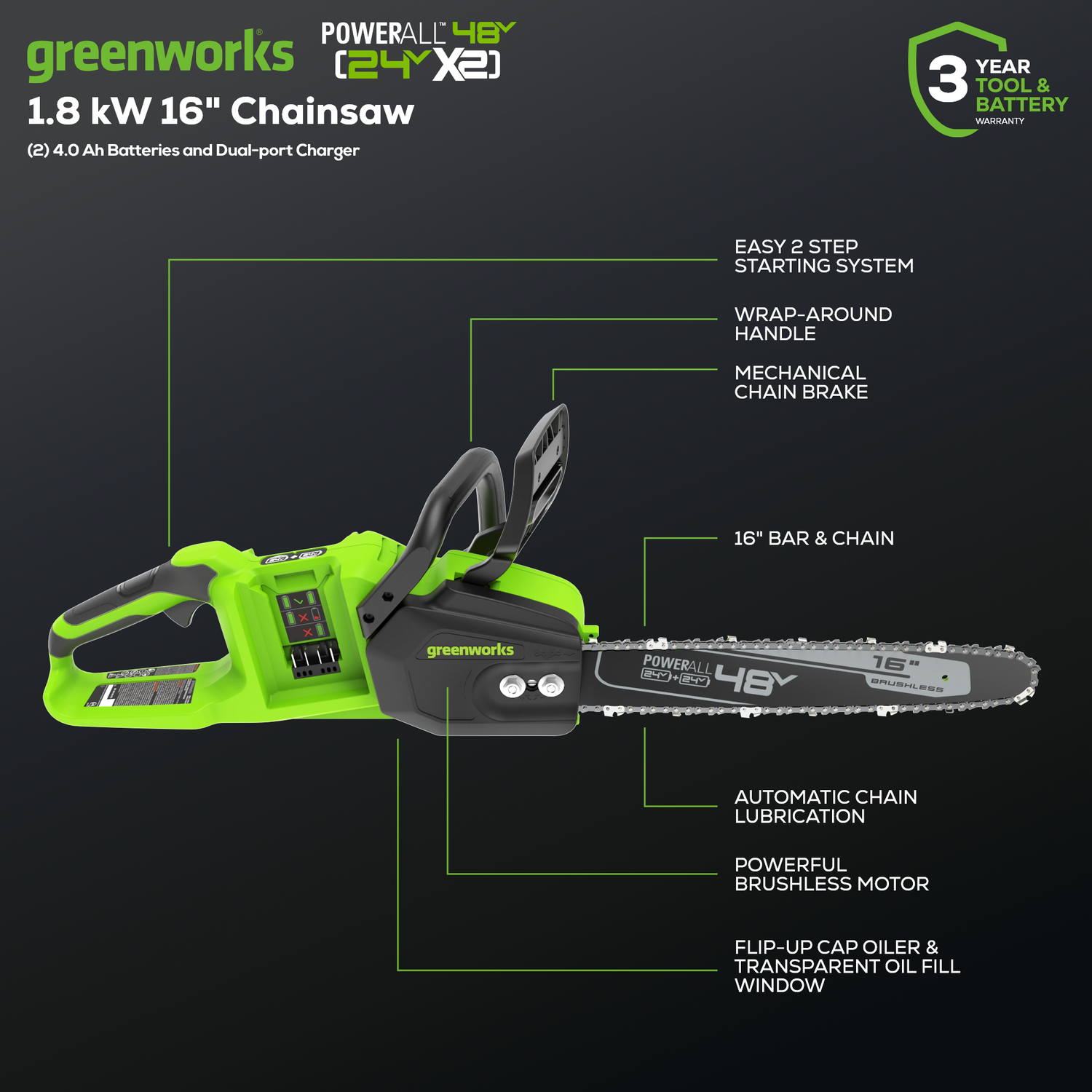 48V (24V x 2) 16'' Chainsaw, (2) 4.0Ah Batteries & Charger Included BONUS: Extra Chain