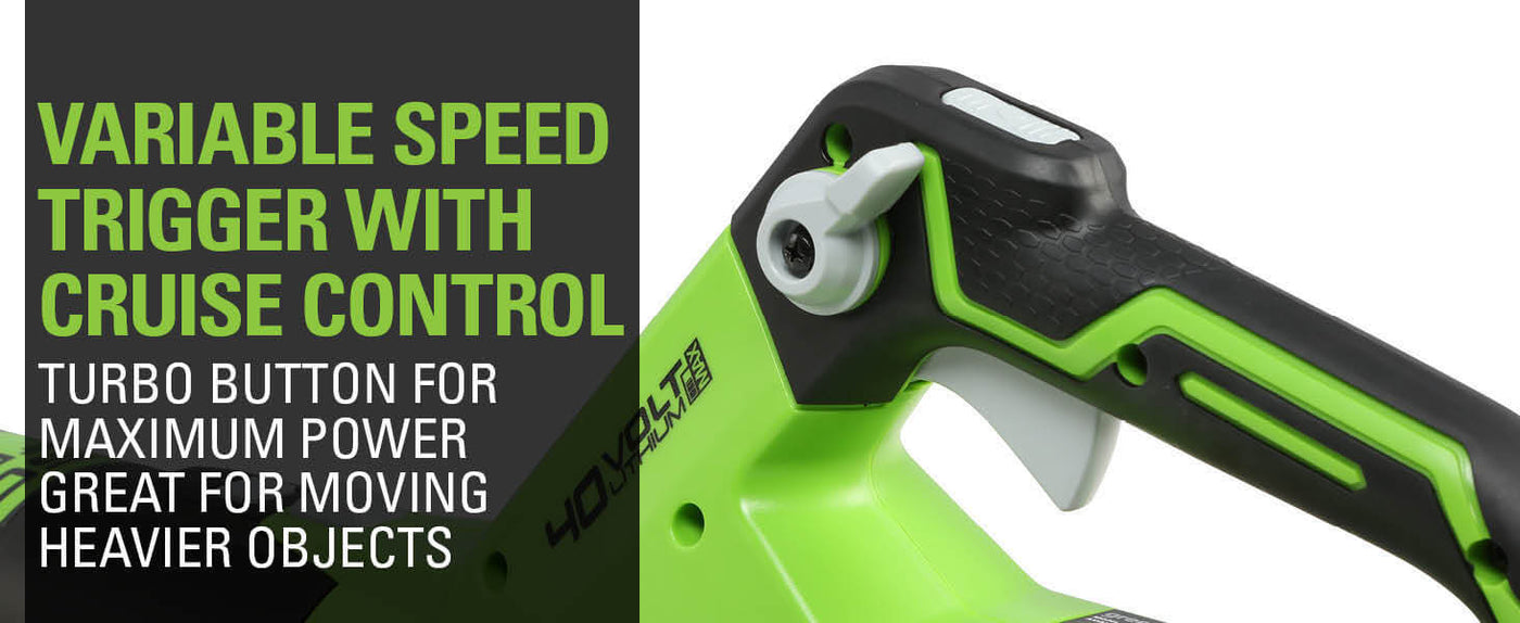 - [CONTROL]: Variable speed trigger along with a turbo button delivers on-demand power for effortless clearing of yards, driveways and patios. Equipped with a cruise control lever for precise speed control and user convenience.