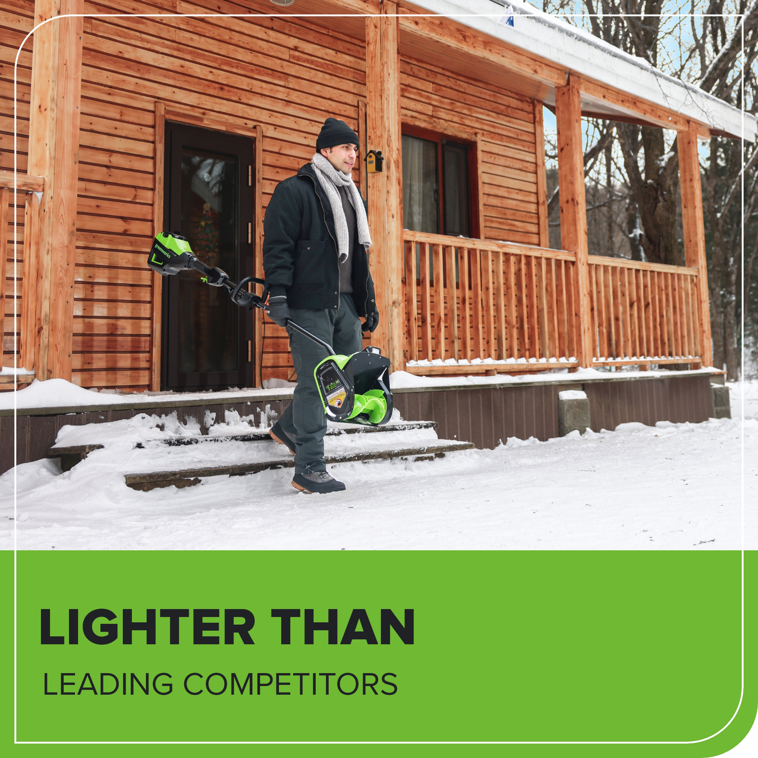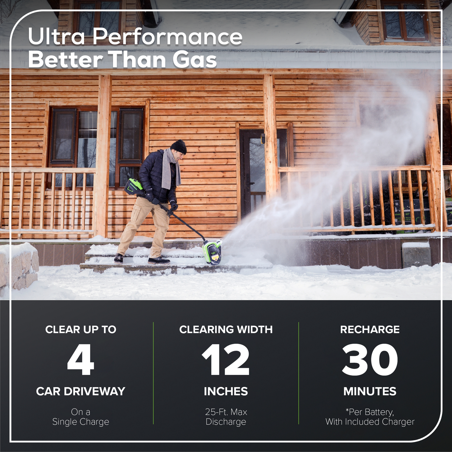 Welcome to a Life. Powered. By Greenworks. Make clearing sidewalks and driveways easier this winter with the Greenworks 80V 12" Brushless Snow Shovel. Built with a high-efficiency 2.5kW brushless motor and two-speed impeller providing speeds up to 2500 RPM, this snow shovel is sure to impress. Bright LED lights and quiet operation make it convenient for use early in the morning or late at night. Powered by an 80V lithium-ion battery, it features a clearing width of 12" and a clearing depth of 8”. Say goodbye to gas this winter and hello to Greenworks. This snow shovel is compatible with the complete Greenworks 80V system of tools and batteries. Backed by a 4-year warranty, this snow shovel is built to last for years to come.