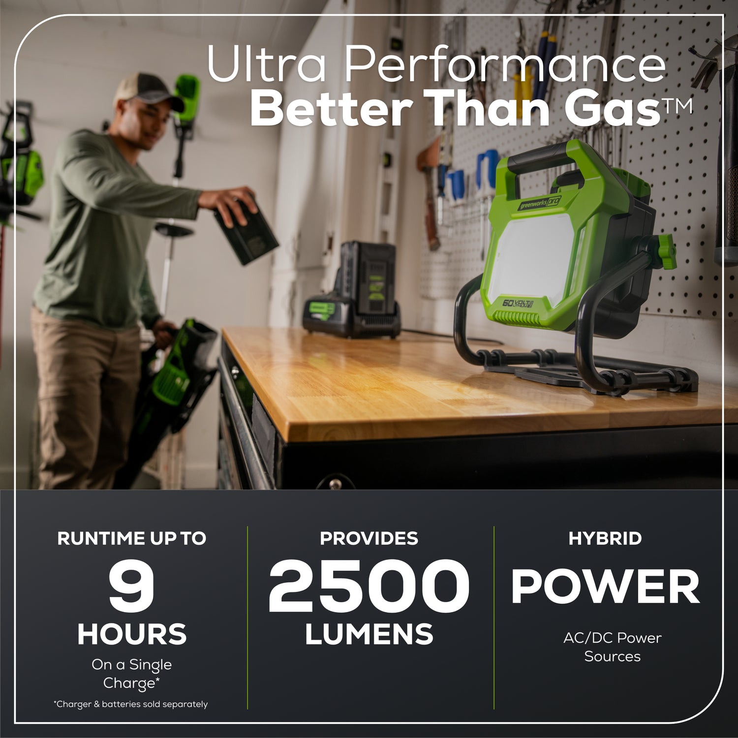 The Greenworks Pro 60V AC/DC 2500 Lumen LED Work Light is versatile and can be used indoors or outdoors. This work light provides ample lighting with its lasting LED bulb. Once detached from the tripod, the easy-grip handle of this LED light allows it to be transported with ease. This electric light also features an AC cord for power.
