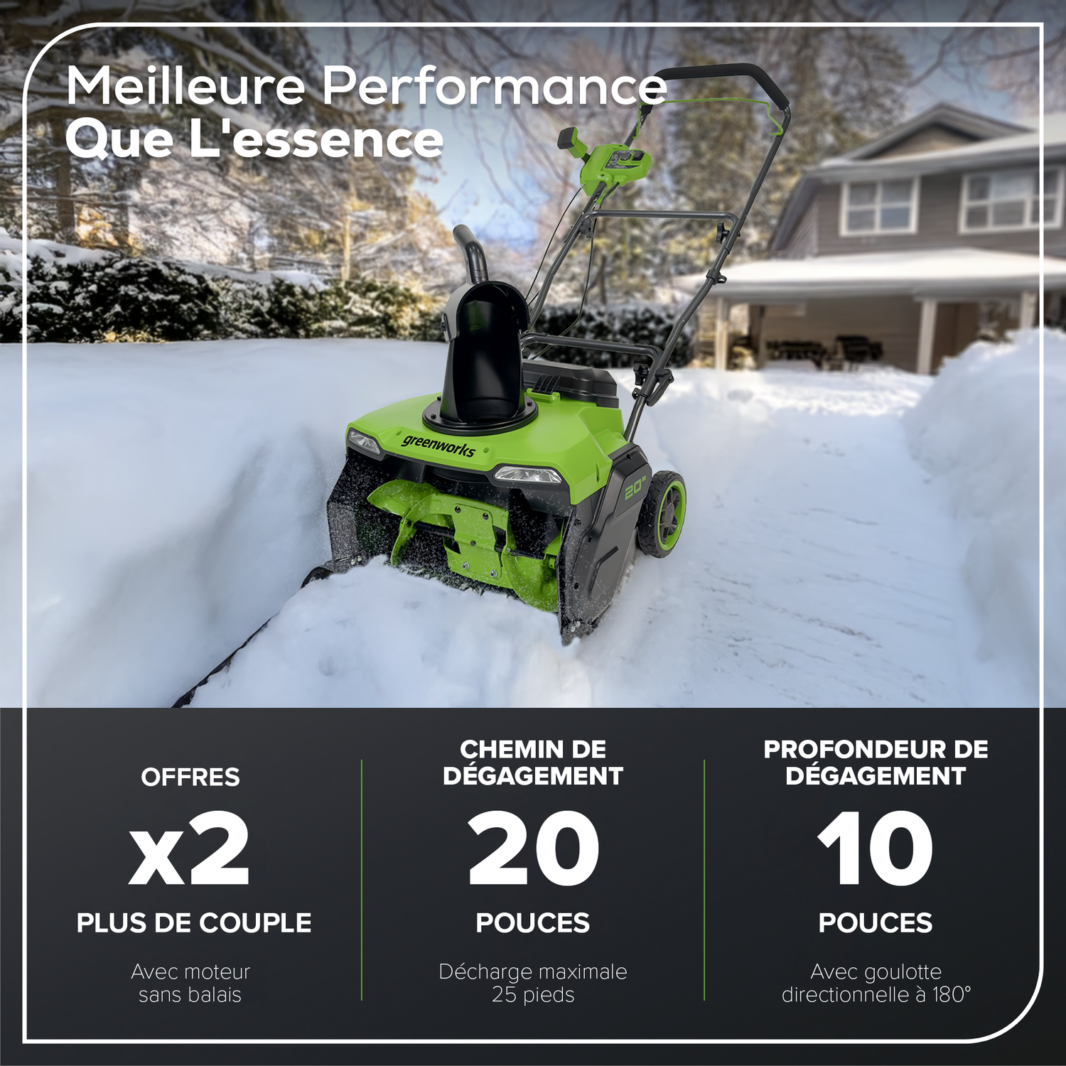 Bienvenue à La Vie. Propulsée. Par Greenworks. Simplifiez-vous l'hiver grâce à la souffleuse à neige sans fil Greenworks 2 x 24 V (48 V) de 20 pouces (20 po), idéale pour dégager les trottoirs, les allées et les terrasses. Fonctionnant avec deux batteries 24 V (vendues séparément) pour une utilisation sans fil, elle dégage une largeur de 50 cm (20 po.) et une profondeur de 10 po. (25 cm) grâce à sa tarière en acier à 3 vitesses, conçue pour durer. Compatible avec toutes les batteries Greenworks 24 V (pour des performances optimales, utilisez une batterie de 4,0 Ah ou plus), elle est équipée d'un levier de rotation de la goulotte à 180° qui projette la neige jusqu'à 25 pi. (7,5 m), et sa conception réduit les fuites. Deux phares à DEL éclairent votre chemin, tandis que les roues à bande de roulement en caoutchouc et la poignée réglable à 2 positions facilitent les manœuvres. Le système de poignée pliable simplifie le rangement et le transport. Passez moins de temps à pelleter et plus de temps à profiter de l'hiver avec la souffleuse à neige Greenworks 2 x 24 V, assortie d'une garantie limitée de 3 ans.