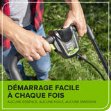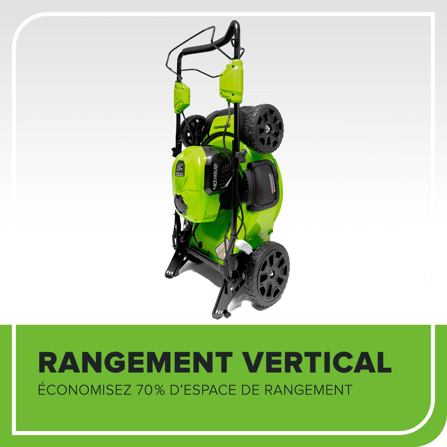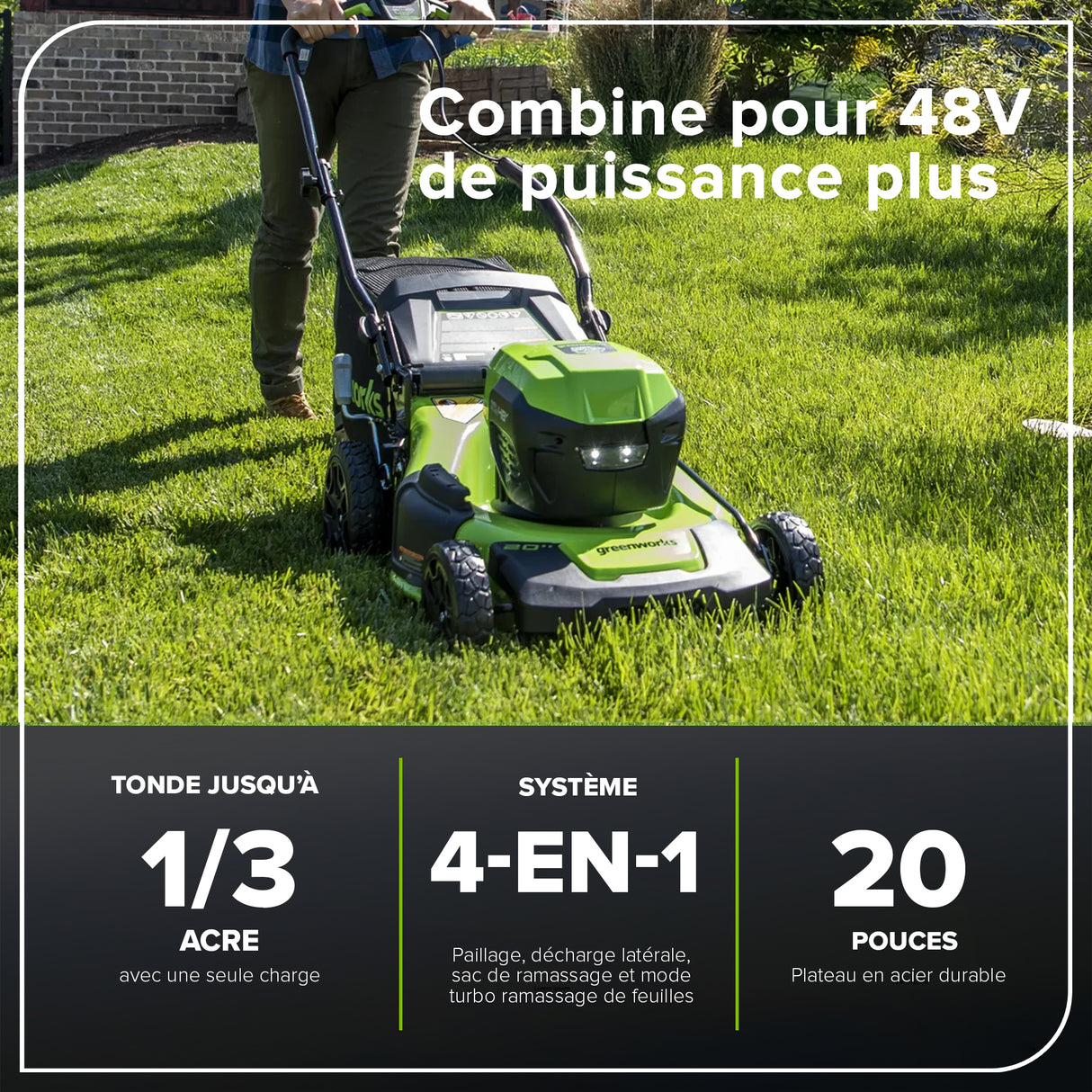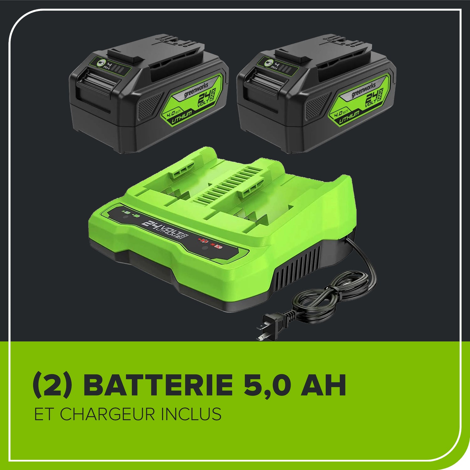 Bienvenue à La Vie. Propulsée. Par Greenworks. La plateforme lithium-ion Greenworks 24 V POWERALL™ alimente plus de 125 produits 24 V intérieurs et extérieurs, notamment des tondeuses, des souffleurs, des coupe-herbes, des scies à chaîne, des outils électroportatifs et bien plus encore ! Nos batteries 24 V fournissent 20 % de puissance en plus et 35 % d'autonomie en plus, et offrent une puissance sans décoloration et sans perte de mémoire après la charge. Donnez un coup de pouce au trottoir et passez au vert sans fumées, sans mélange, sans entretien et sans cordons de traction. Laissez Greenworks vous aider à simplifier les travaux de jardinage. Gardez votre pelouse incroyable avec la tondeuse automotrice sans balais Greenworks 2 x 24 V (48 V) 20 pouces (2) batteries USB 5 Ah et chargeur double port 4 A. Cette tondeuse à gazon sans fil fonctionnant sur batterie est dotée d'un carter en acier, de 7 hauteurs de coupe et de la technologie innovante SmartCut, démarrage par bouton-poussoir et poignées rabattables pour un rangement compact lorsque vous recherchez des outils et des équipements électriques d'extérieur, nous savons que vous pensez à la qualité. C'est pourquoi Greenworks soutient nos outils 24 V avec une garantie limitée de 3 ans sur les outils et la batterie.