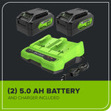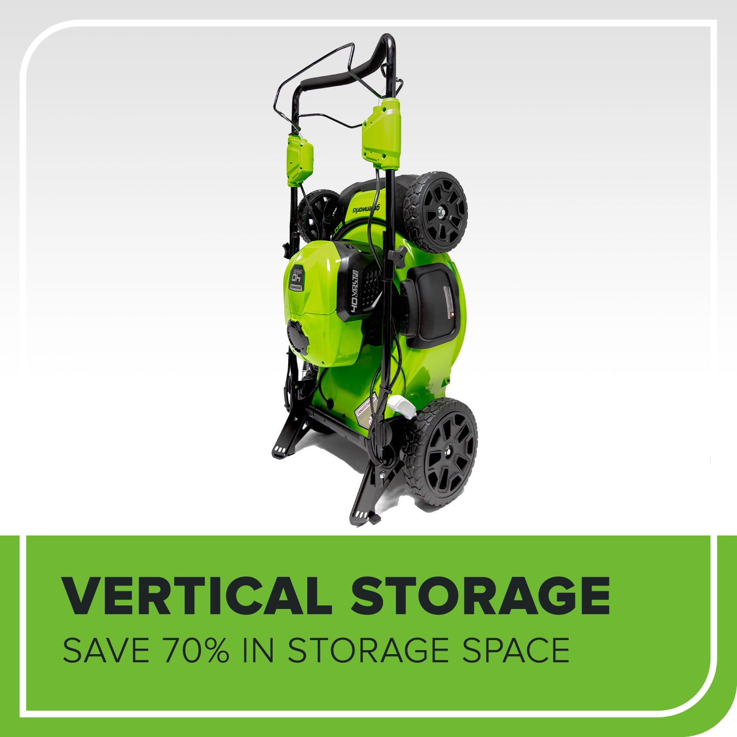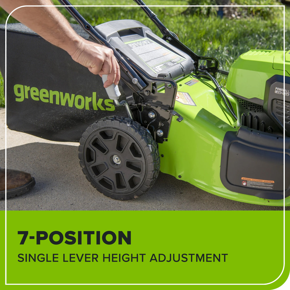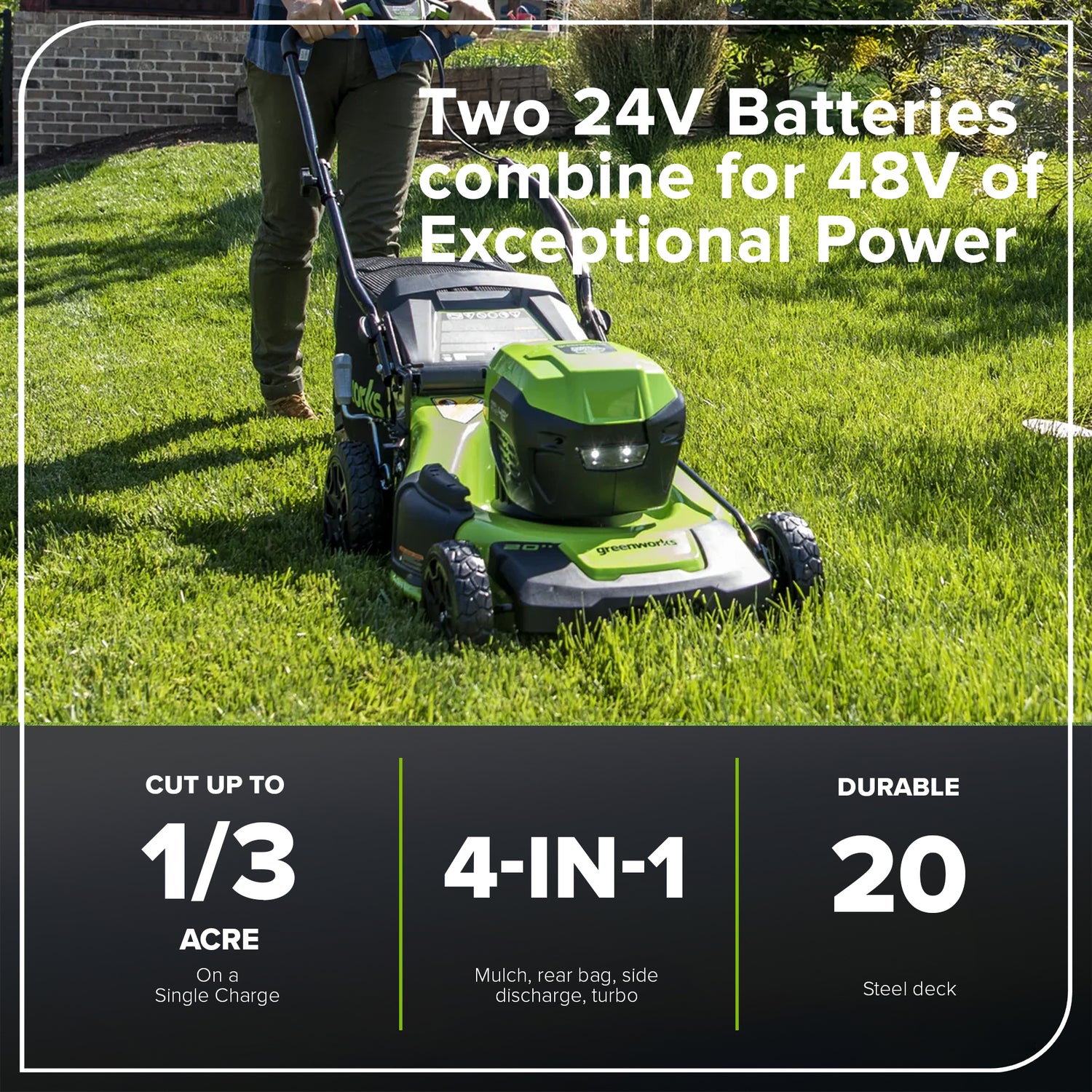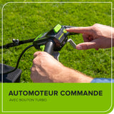 Bienvenue à La Vie. Propulsée. Par Greenworks. La plateforme lithium-ion Greenworks 24 V POWERALL™ alimente plus de 125 produits 24 V intérieurs et extérieurs, notamment des tondeuses, des souffleurs, des coupe-herbes, des scies à chaîne, des outils électroportatifs et bien plus encore ! Nos batteries 24 V fournissent 20 % de puissance en plus et 35 % d'autonomie en plus, et offrent une puissance sans décoloration et sans perte de mémoire après la charge. Donnez un coup de pouce au trottoir et passez au vert sans fumées, sans mélange, sans entretien et sans cordons de traction. Laissez Greenworks vous aider à simplifier les travaux de jardinage. Gardez votre pelouse incroyable avec la tondeuse automotrice sans balais Greenworks 2 x 24 V (48 V) 20 pouces (2) batteries USB 5 Ah et chargeur double port 4 A. Cette tondeuse à gazon sans fil fonctionnant sur batterie est dotée d'un carter en acier, de 7 hauteurs de coupe et de la technologie innovante SmartCut, démarrage par bouton-poussoir et poignées rabattables pour un rangement compact lorsque vous recherchez des outils et des équipements électriques d'extérieur, nous savons que vous pensez à la qualité. C'est pourquoi Greenworks soutient nos outils 24 V avec une garantie limitée de 3 ans sur les outils et la batterie.