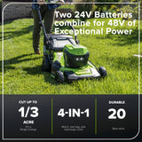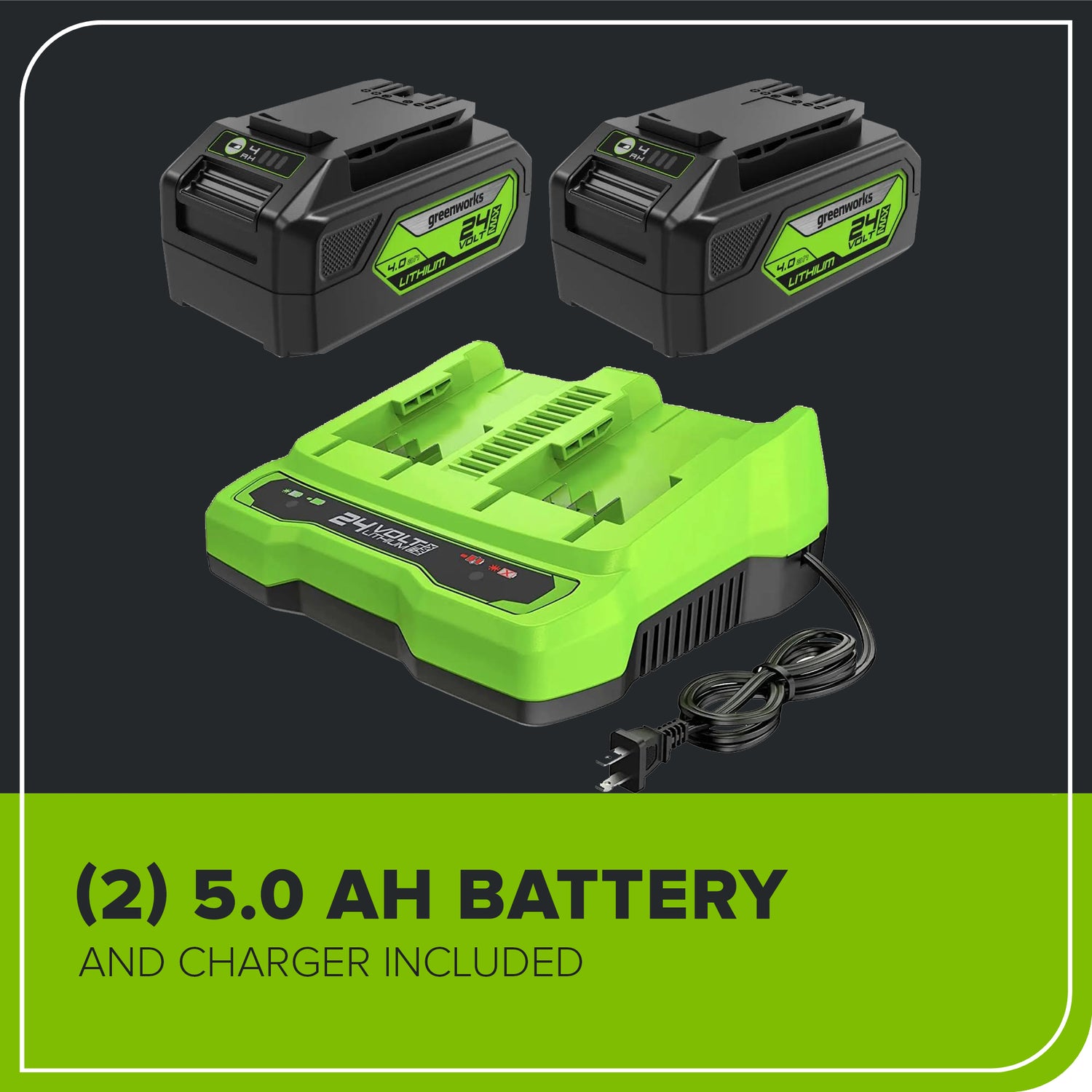 - NE JAMAIS ARRÊTER DE TONDRE Deux batteries Greenworks 24 V POWERALL se combinent pour 48 V d'une puissance exceptionnelle, meilleure que l'essence sans quitter la plate-forme de batterie 24 V . Jusqu'à 50 minutes d'autonomie avec les batteries incluses et un temps de charge de 75 minutes par batterie. De plus, le port USB intégré à la batterie charge tous les appareils électroniques portables, y compris les téléphones et les tablettes.