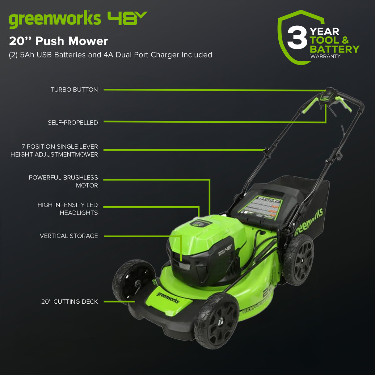 Tondeuse autotractée sans balais de 48 V (2 x 24 V), 20 pouces, (2) batteries USB 5 Ah et chargeur double port 4 A inclus