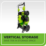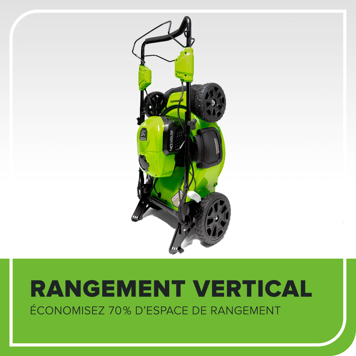 RANGEMENT PRATIQUE Les positions des poignées réglables en fonction de votre taille et les commandes utilisateur ergonomiques et faciles à utiliser garantissent un confort ultime. De plus, utilisez jusqu'à 70 % d'espace en moins dans votre garage grâce aux poignées pliables pour un rangement vertical compact.