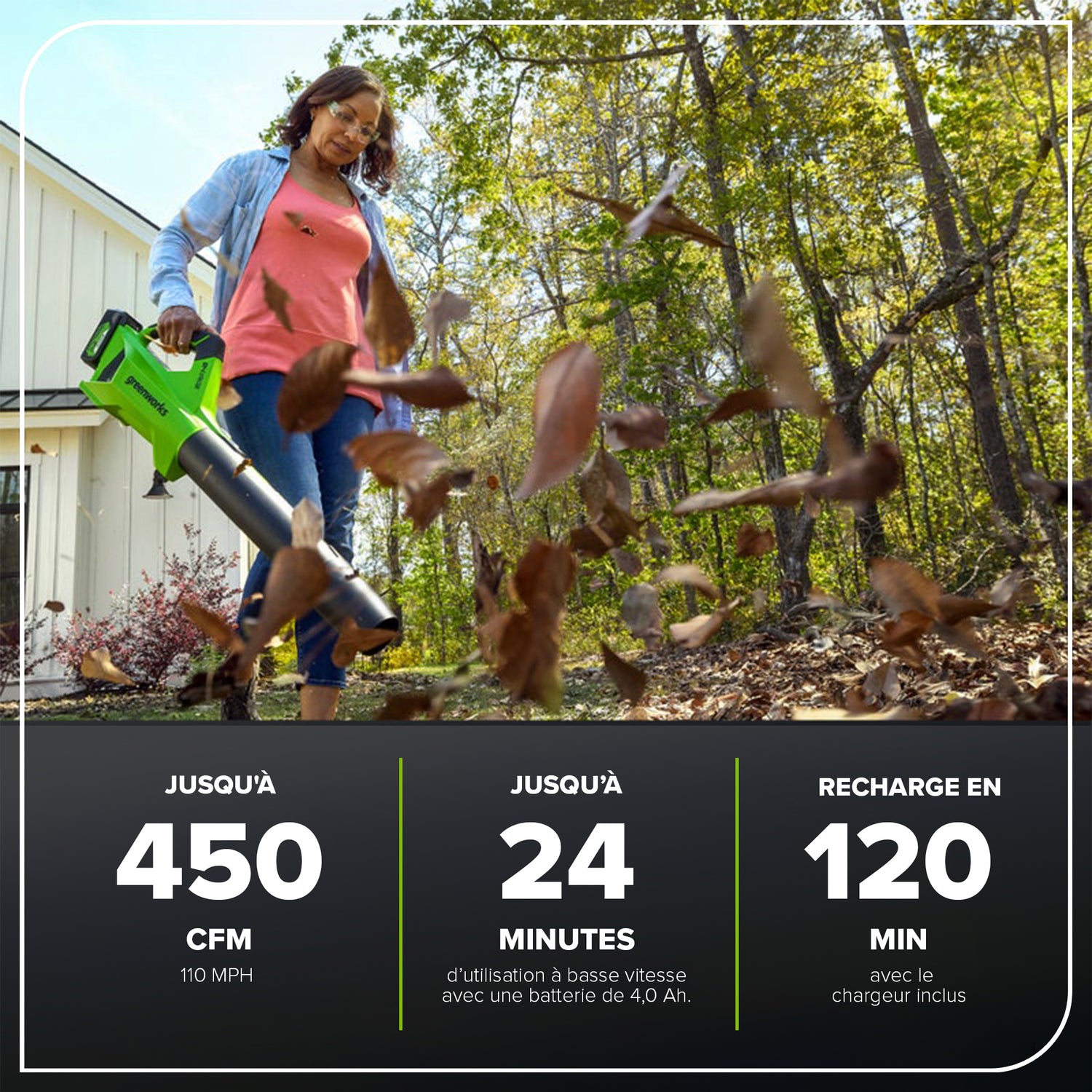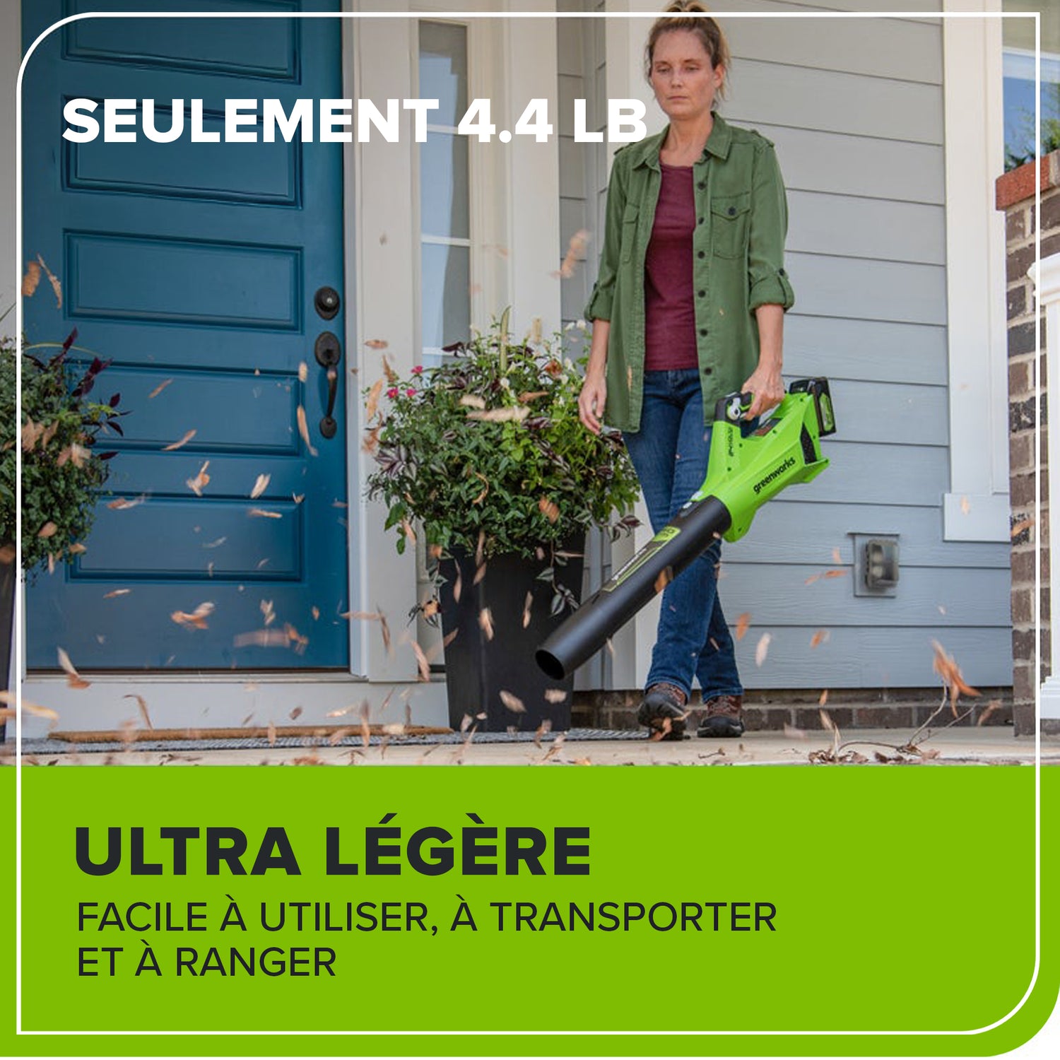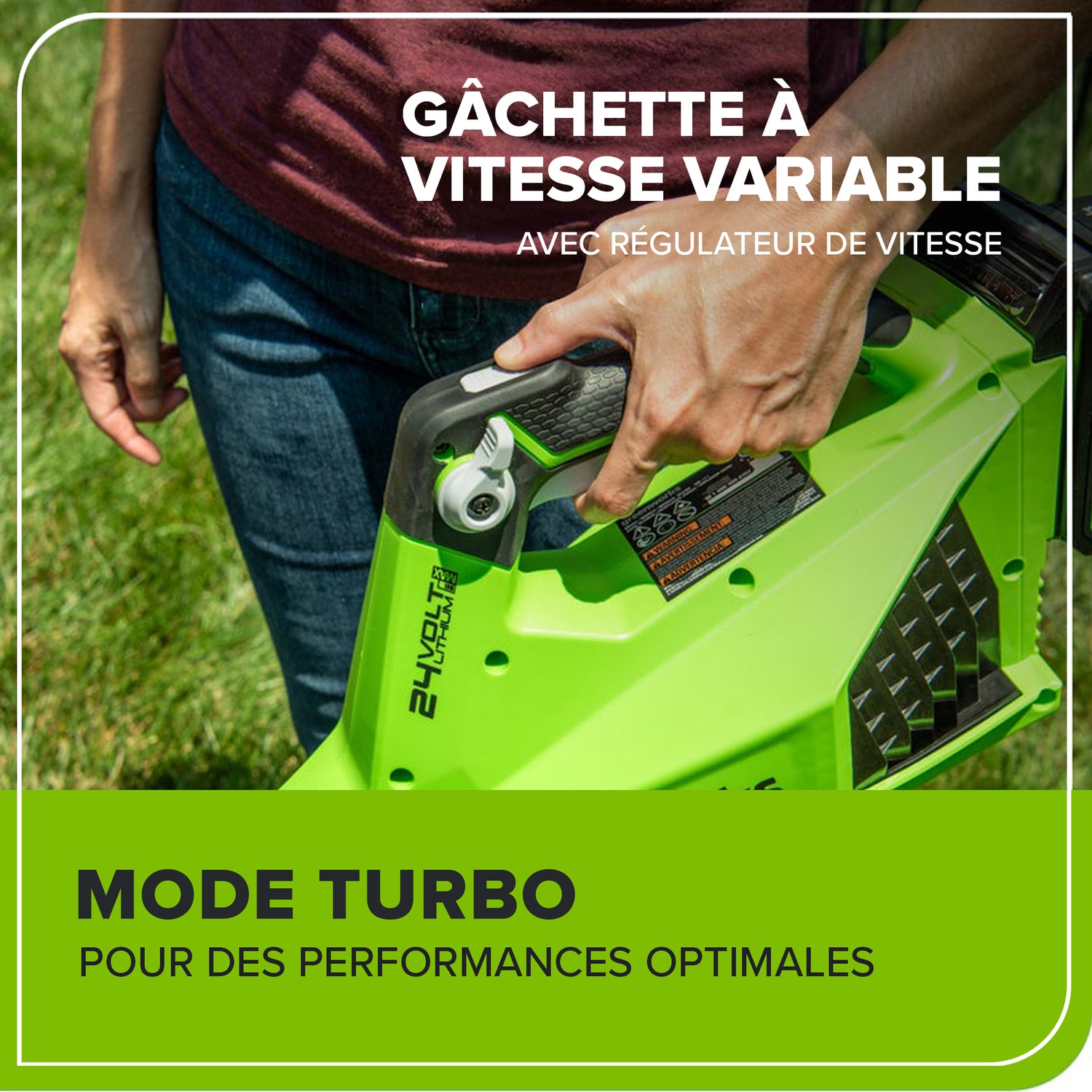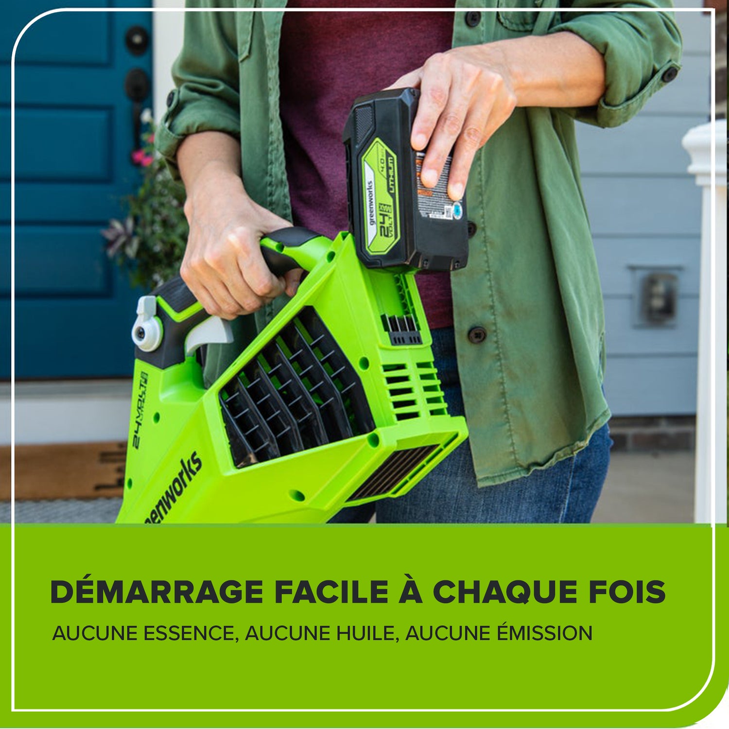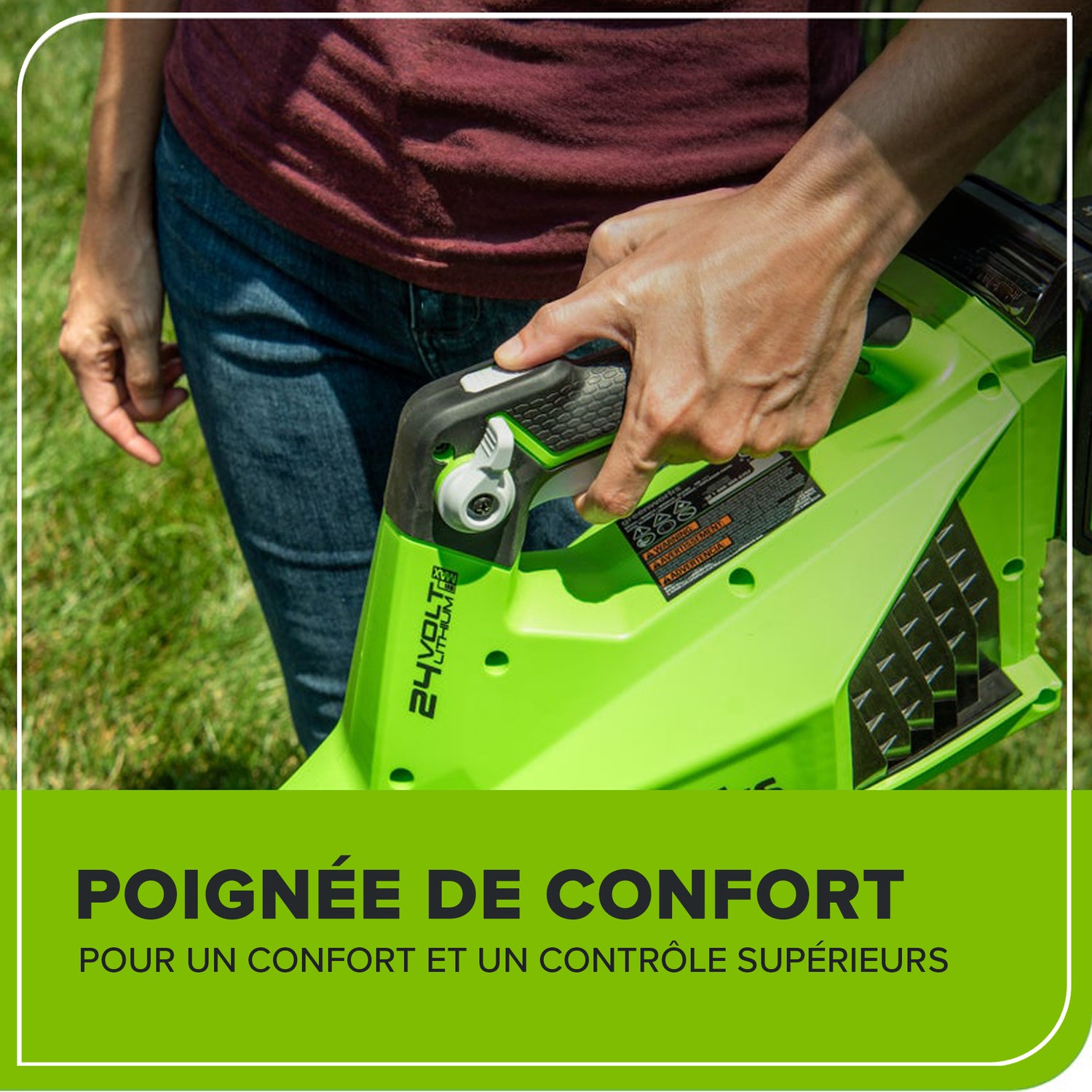 La plateforme lithium-ion 24 V alimente plus de 50 produits d'intérieur et d'extérieur, notamment des tondeuses, des souffleurs, des coupe-herbes, des scies à chaîne, des outils électriques et bien plus encore ! La batterie lithium-ion 24 V fournit 20 % de puissance en plus et 35 % d'autonomie en plus, et offre une puissance sans décoloration et sans perte de mémoire après la charge. L'équipement électrique extérieur vous permet d'attaquer jusqu'à 1/4 acre avec les batteries disponibles de 1,5 Ah, 2 Ah et 4 Ah. Les ports USB sont intégrés aux batteries BAG711, BAG708 et BAG709, ce qui en fait un chargeur portable pour téléphones, tablettes et autres accessoires électroniques compatibles. La plateforme Greenworks 24 V est livrée avec une garantie outil/batterie de 3 ans pour protéger votre investissement.