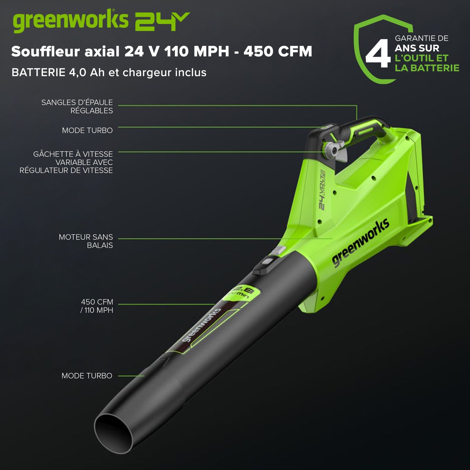 Souffleur à feuilles sans balais 24 V, batterie USB 4,0 Ah et chargeur inclus – BL24L410