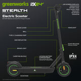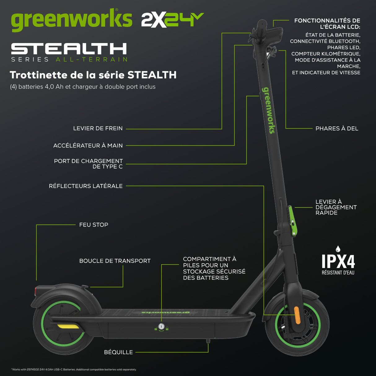 Trottinette électrique 48 V (2 x 24 V) de la série STEALTH, (4) batteries 4,0 Ah et chargeur à double port inclus