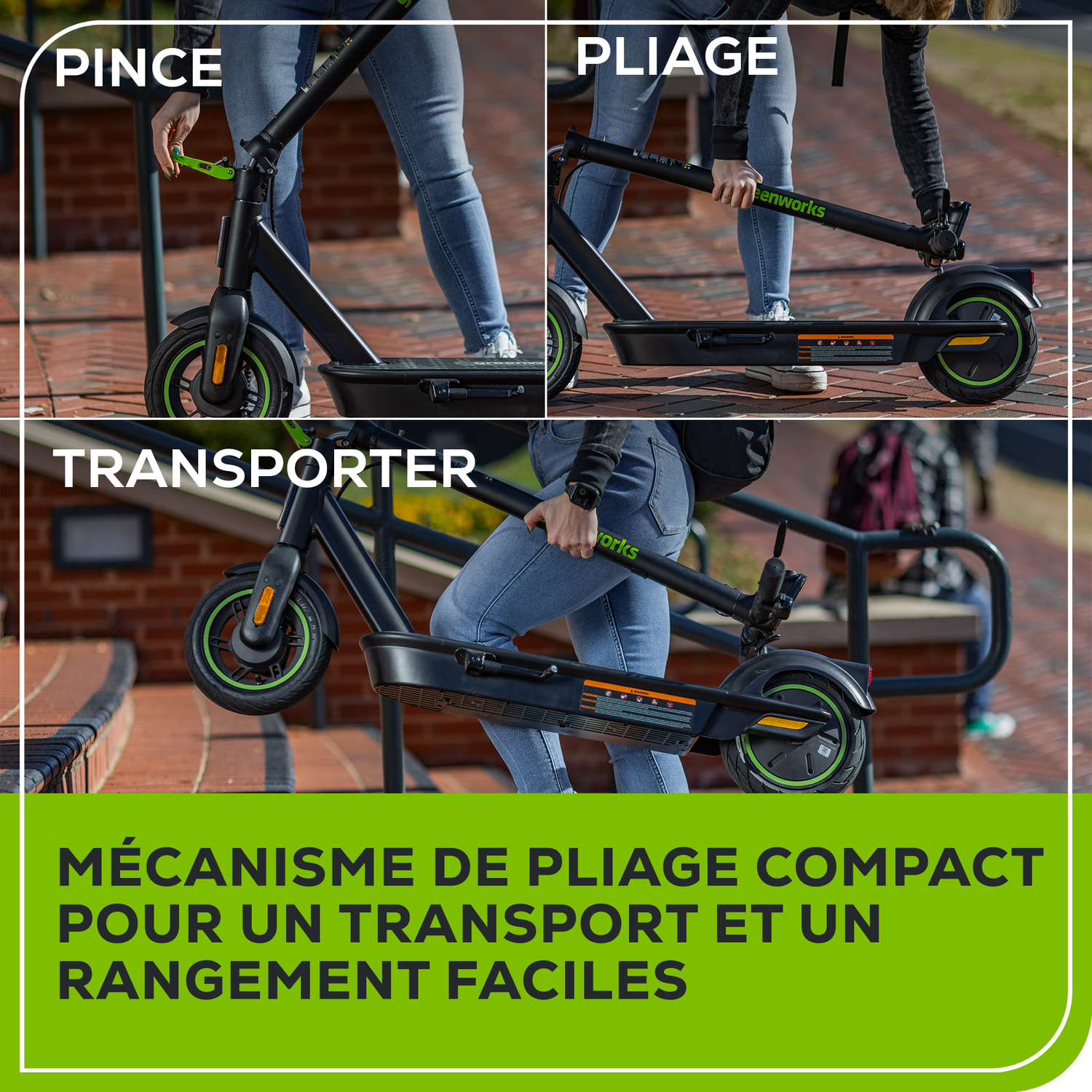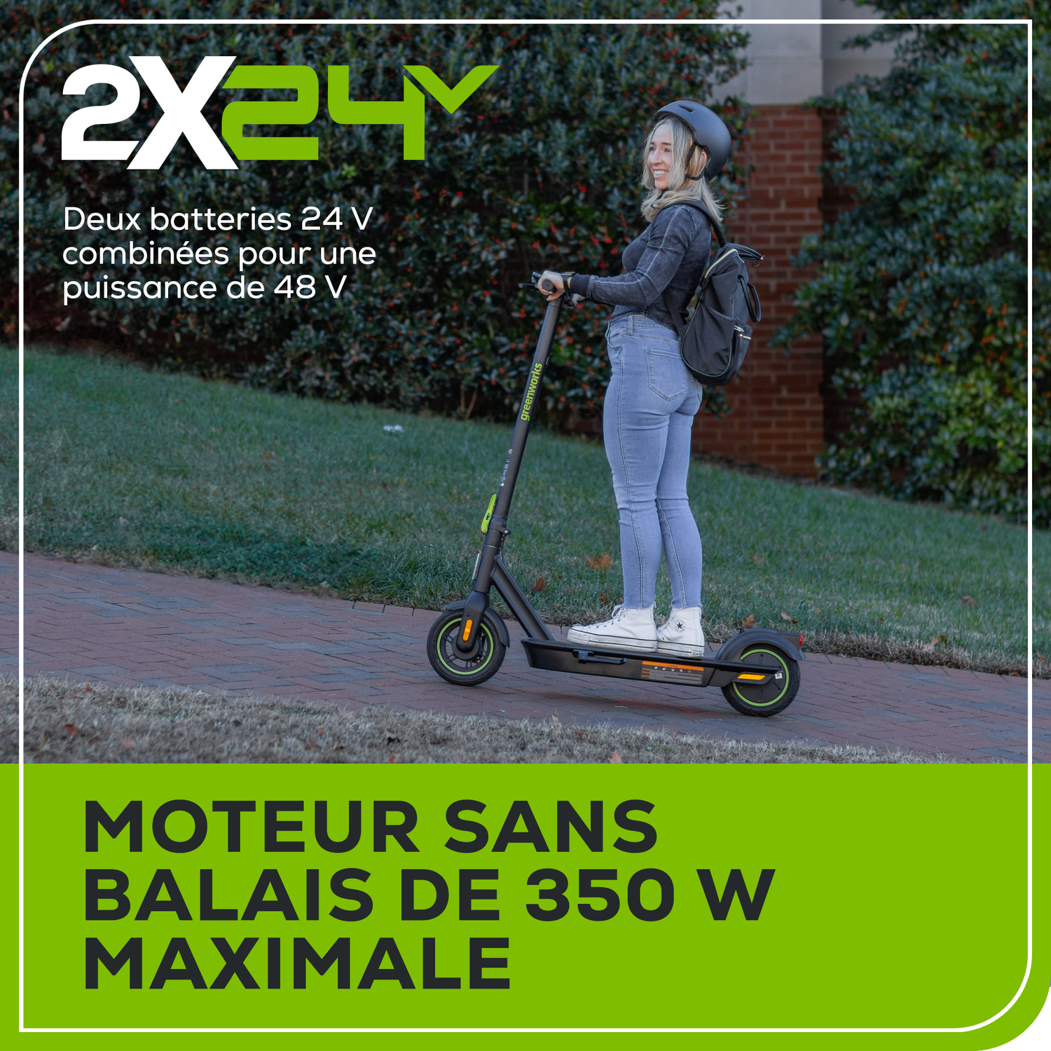 Bienvenue à La Vie. Propulsée. Par Greenworks. Découvrez une puissance, une autonomie et un style extrêmes avec la trottinette électrique Greenworks, votre compagnon idéal pour les trajets en ville et les aventures au long cours. Alimenté par un moteur de moyeu arrière de 350 W, il atteint des vitesses allant jusqu'à 30 km/h (18,8 MPH), offrant une accélération en douceur et des performances fiables. La conception compacte et pliable le rend facile à transporter et à ranger, tandis que les pneus tubeless de 10 pouces assurent une conduite stable et confortable. Fonctionnant sur la plateforme polyvalente PowerAll 2x24 V, cette trottinette électrique la compatibilité de la batterie avec plus de 125 autres produits Greenworks 24 V. Avec une autonomie maximale de 16 km (10 miles) et une capacité de poids de 265 lb, il est conçu pour tous les cyclistes en quête de liberté et de commodité. L'aventure vous attend, que vous parcouriez les rues de la ville ou que vous exploriez au-delà.