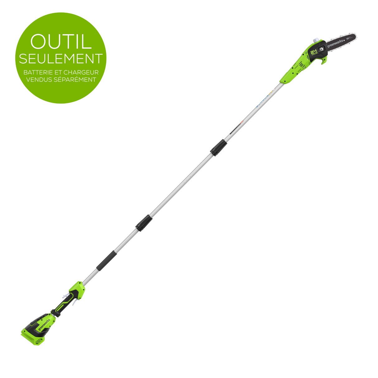 - Outil seulement avec batterie et chargeur vendus séparément (ou partagez votre batterie 24 V existante avec cette scie à perche sans fil)