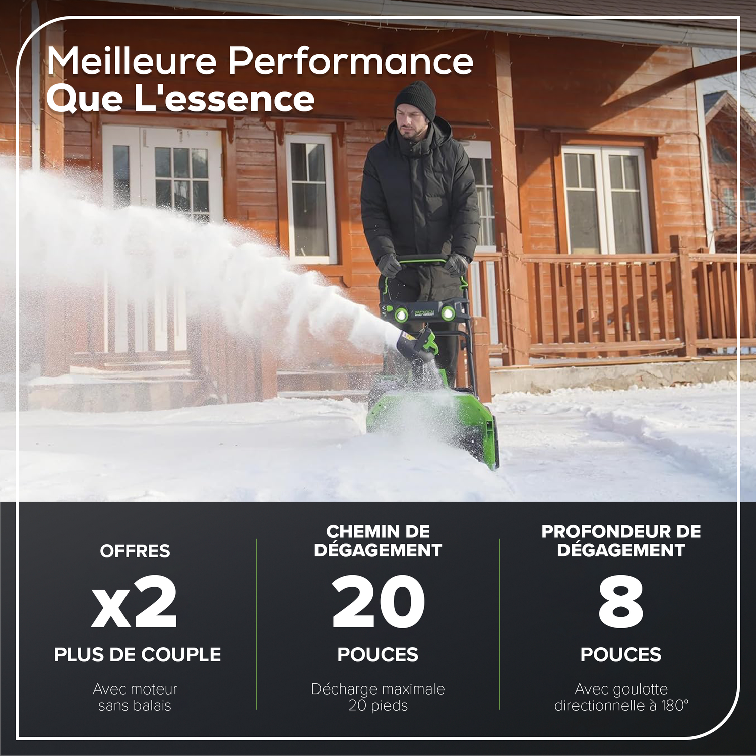 - SANS BALAIS : Le moteur sans balais de 1,1 kW très efficace offre un couple accru, des durées de fonctionnement plus longues, un fonctionnement silencieux et une durée de vie prolongée du moteur. Fournit une puissance à la demande jusqu'à 1900 tr/min. Dégage rapidement les entrées, les trottoirs, les patios et plus encore avec un chemin de dégagement de 20 po. et une profondeur de dégagement de 8 po.