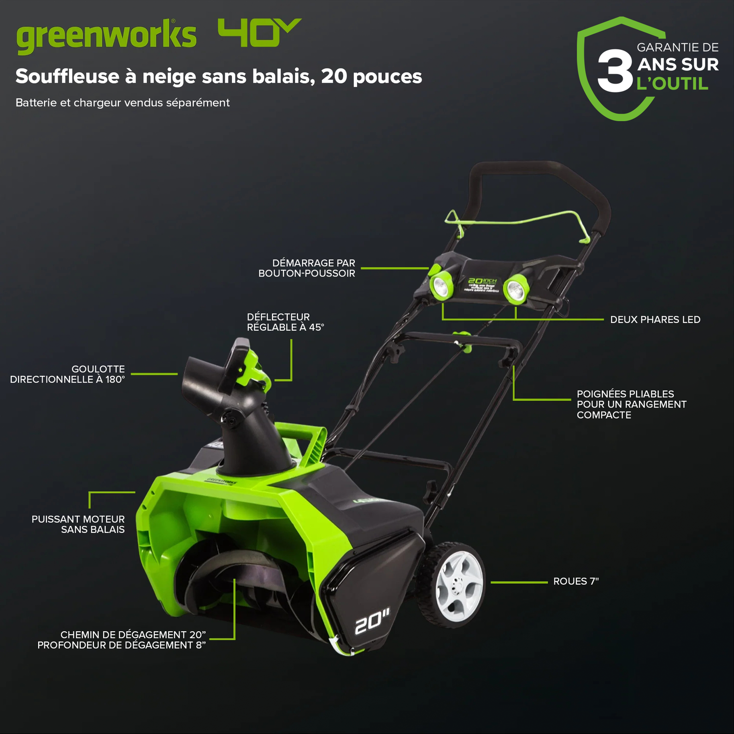 Bienvenue à La Vie. Propulsée. Par Greenworks. Idéale pour déneiger les trottoirs, les entrées et les patios, cette souffleuse à neige Greenworks 40 V est l'outil à avoir lorsque la neige tombe. Cette souffleuse à neige à une phase à batterie de 40 V qui permet un fonctionnement sans fil facile et pratique ; commencez avec une trousse à outils, puis ajoutez un équipement contenant uniquement des outils. Cette souffleuse à neige est compatible avec toutes les batteries Greenworks 40V (vendues au Canada). Avec la goulotte rotative à 180°, vous pouvez projeter la neige jusqu'à 20 pieds dans la direction souhaitée. Pour le dégagement de nuit, cette souffleuse est dotée de deux phares à DEL pour augmenter la visibilité, et ses roues arrière de 7 po la rendent facile à manœuvrer pour déneiger à tout moment de la journée. De plus, son système de pliage convivial facilite le rangement ou le transport. équipé cet hiver de la souffleuse à neige Greenworks 40V et passez moins de temps à pelleter la neige et plus de temps à profiter d'un feu chaud. Chaque outil Greenworks 40V est équipé d'une garantie limitée de 3 ans, garantissant la protection de votre investissement.