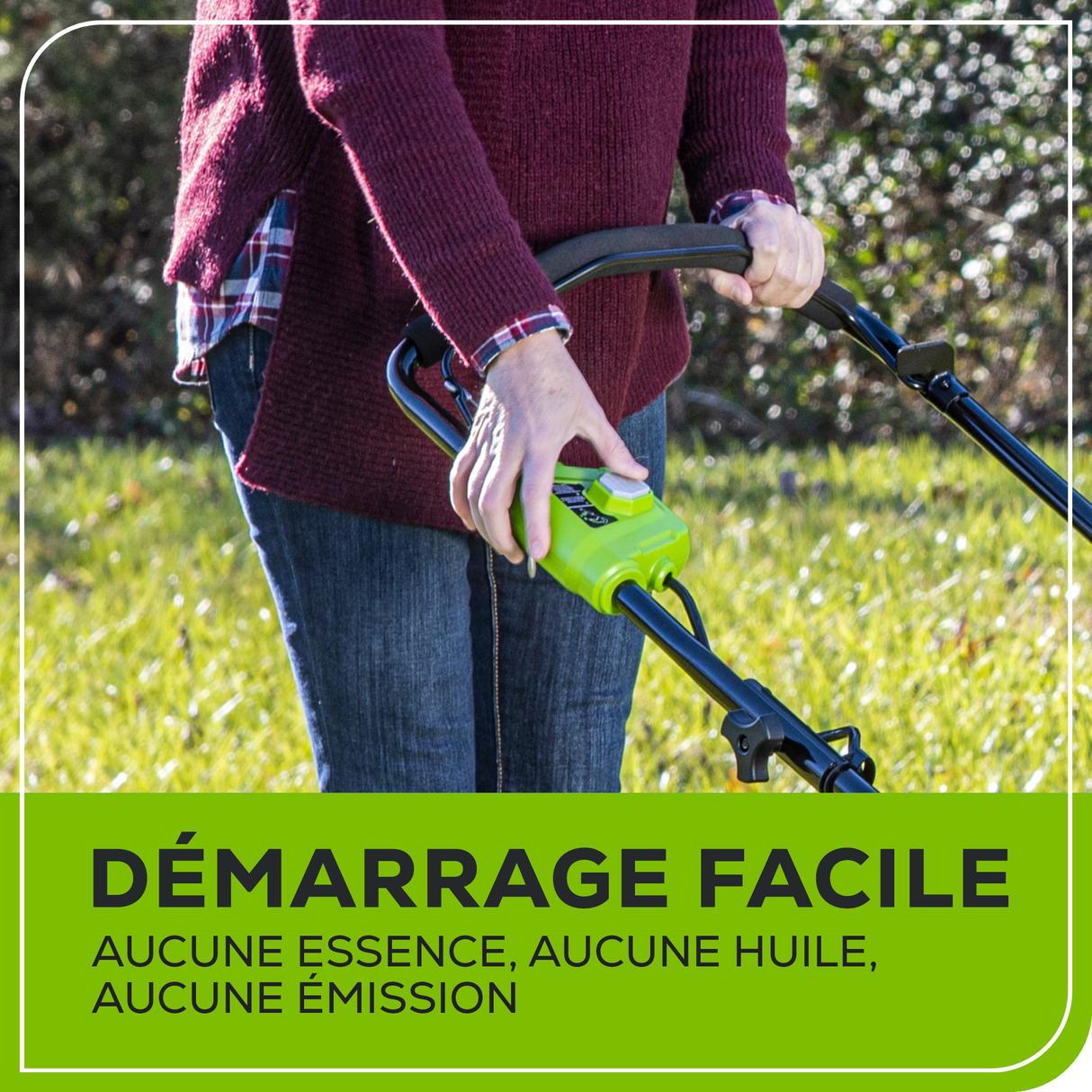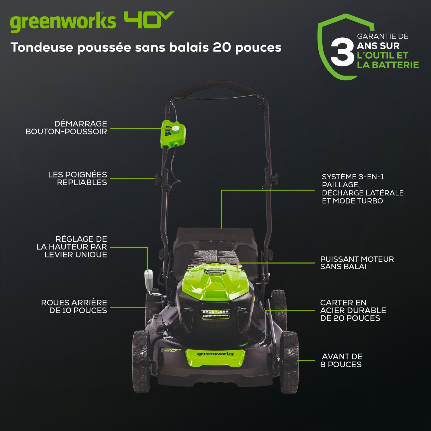 Bienvenue à La Vie. Propulsée. Par Greenworks. Donnez un coup de pouce au trottoir et passez au vert sans fumées, sans mélange, sans entretien et sans cordons de traction. La plate-forme lithium-ion Greenworks 40 V alimente plus de 75 produits, notamment des tondeuses, des souffleurs, des coupe-herbes, des scies à chaîne, des taille-haies et bien plus encore ! Offre la puissance dont vous avez besoin avec des performances sans décoloration et sans perte de mémoire après la charge. Laissez Greenworks vous aider à simplifier les travaux de jardinage. Tondez votre gazon facilement grâce à la tondeuse poussée sans fil Greenworks 40 V, 20 pouces, batterie 4,0 Ah et chargeur inclus. Cette tondeuse sans fil fonctionnant sur batterie comprend un carter en acier, 7 hauteurs de coupe, la technologie innovante SmartCut, un fonctionnement silencieux, un démarrage par bouton-poussoir et des poignées rabattables. pour un stockage compact. Conçue pour durer ; la plateforme Greenworks 40 V est livrée avec une garantie de 3 ans sur les outils et la batterie pour protéger votre investissement.