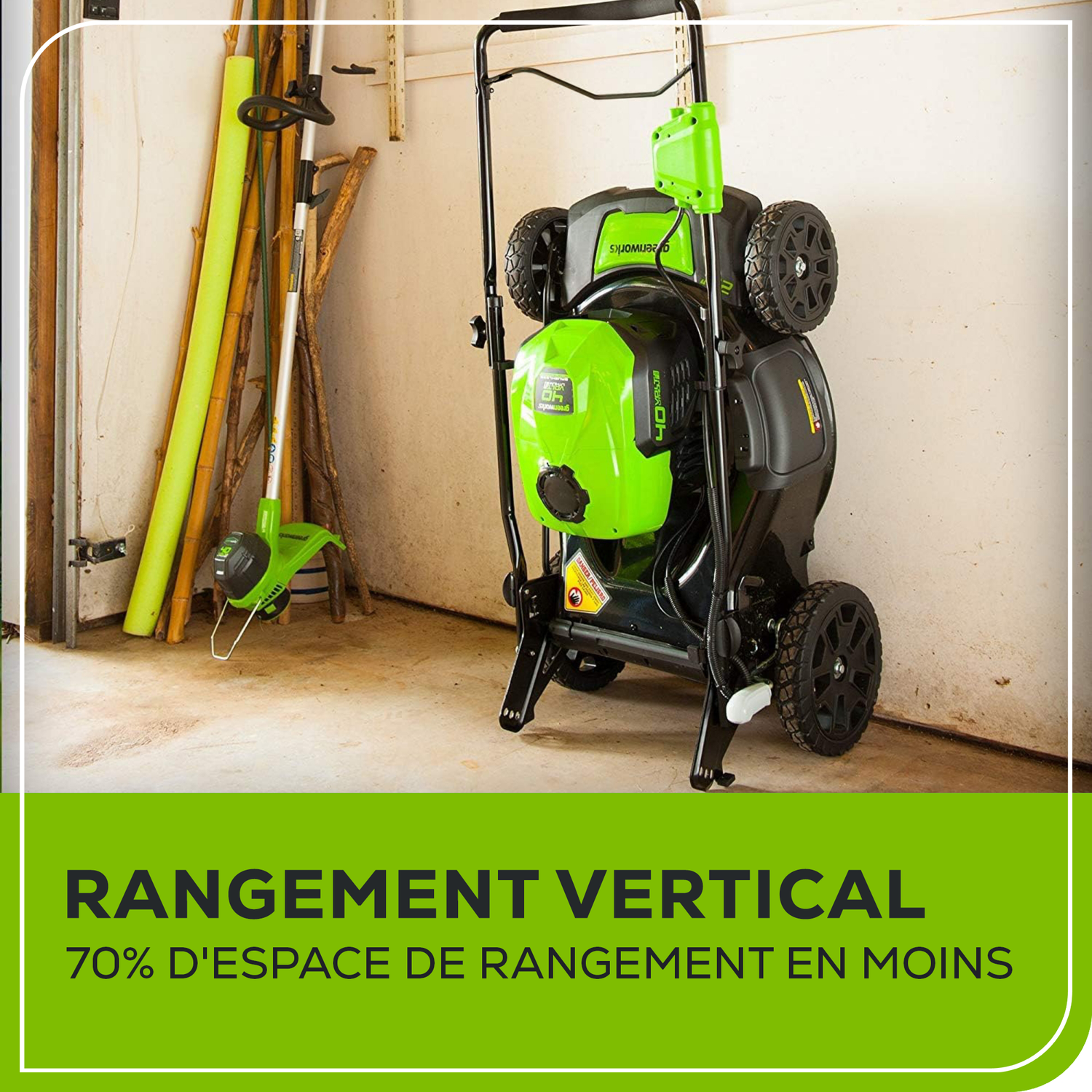 • RANGEMENT PRATIQUE Les positions des poignées réglables en fonction de votre taille et les commandes utilisateur ergonomiques et faciles à utiliser garantissent un confort ultime. De plus, utilisez jusqu'à 70 % d'espace en moins dans votre garage grâce aux poignées pliables pour un rangement vertical compact.